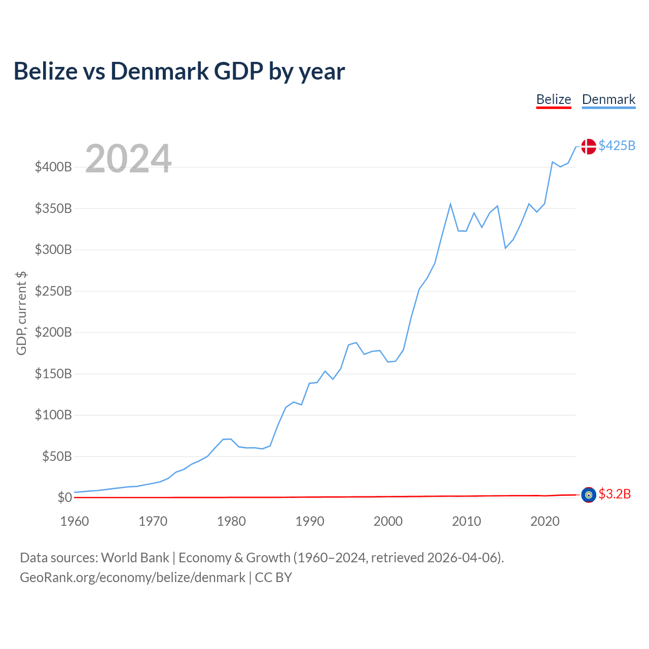 Belize has a GDP of $3.2B compared to $425B for Denmark, ranking 168/197 and 37/197 by economy size, respectively.
