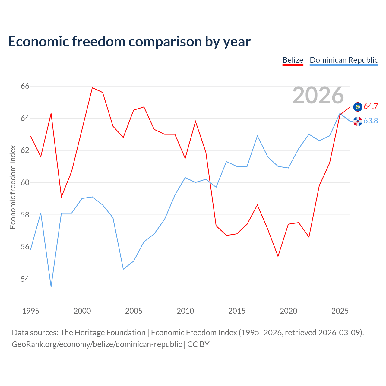 The Economic Freedom Index for Belize is 64.7, ranking 71/197, compared to 63.8 for the Dominican Republic, ranking 77/197. The chart above displays a comparison of annual changes in economic freedom indexes.
