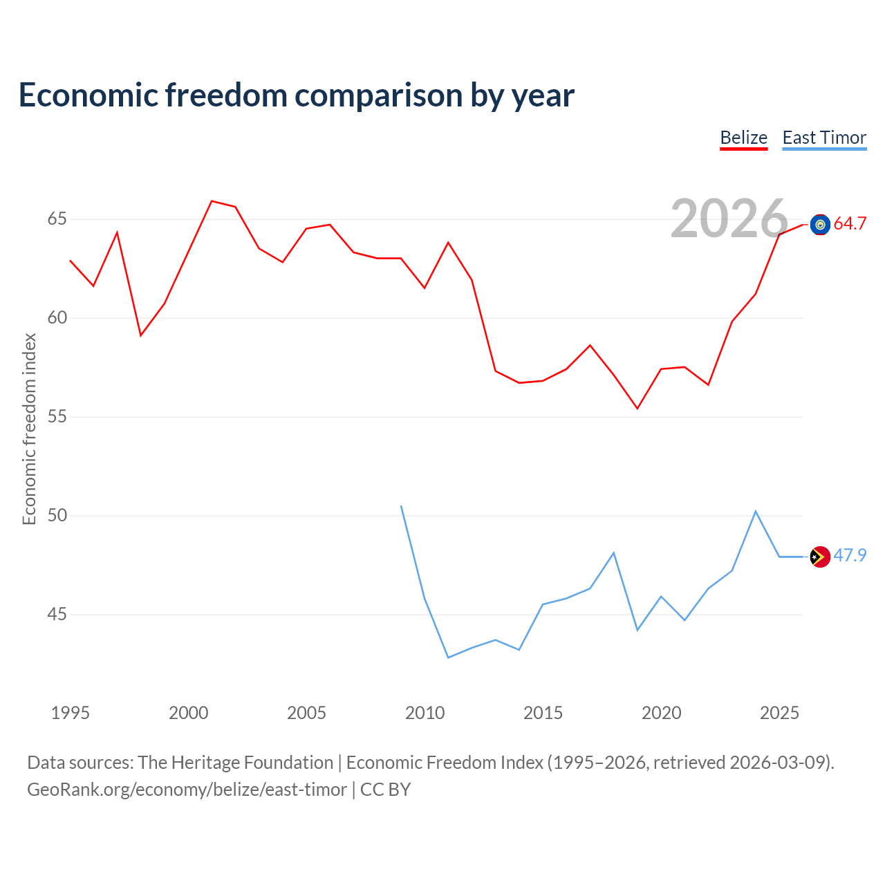 The Economic Freedom Index for Belize is 64.7, ranking 71/197, compared to 47.9 for East Timor, ranking 173/197. The chart above displays a comparison of annual changes in economic freedom indexes.