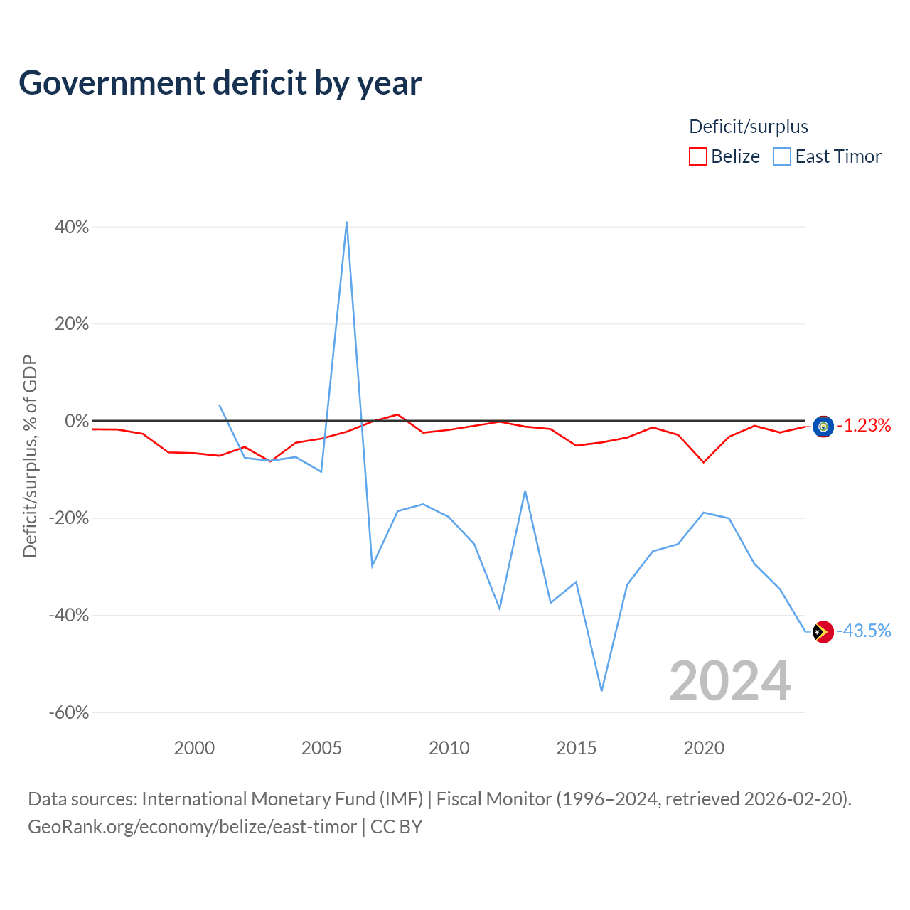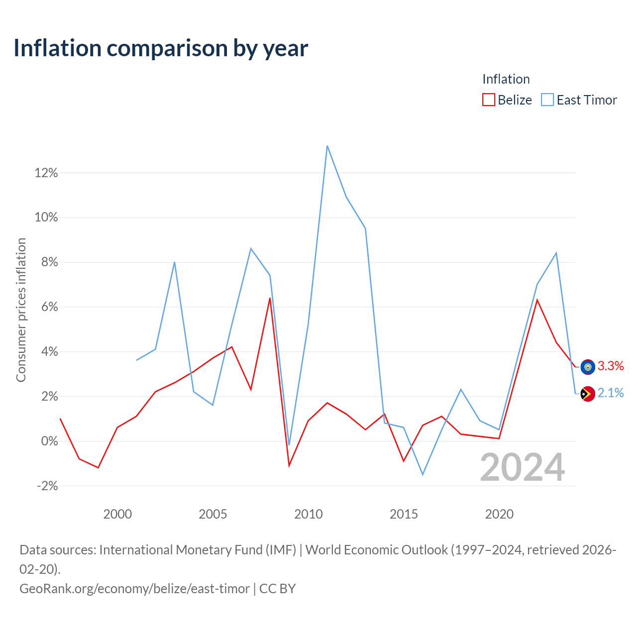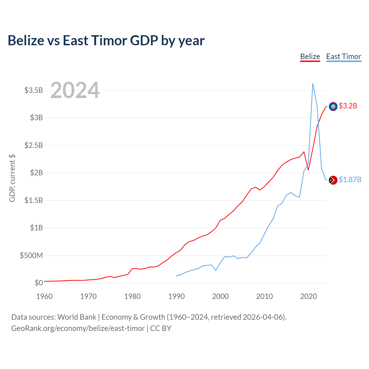 Belize has a GDP of $3.2B compared to $1.87B for East Timor, ranking 168/197 and 181/197 by economy size, respectively.