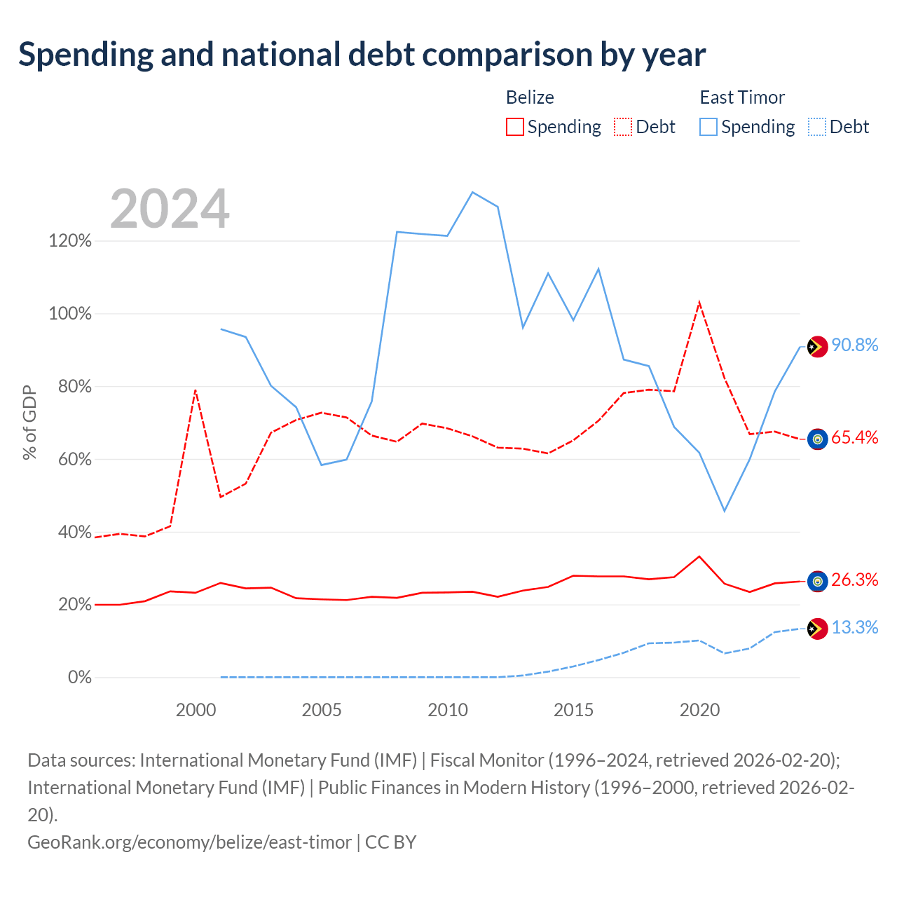 Belize has $2.1B in government debt (65.4% of GDP), compared to $249M (13.3% of GDP) in East Timor.