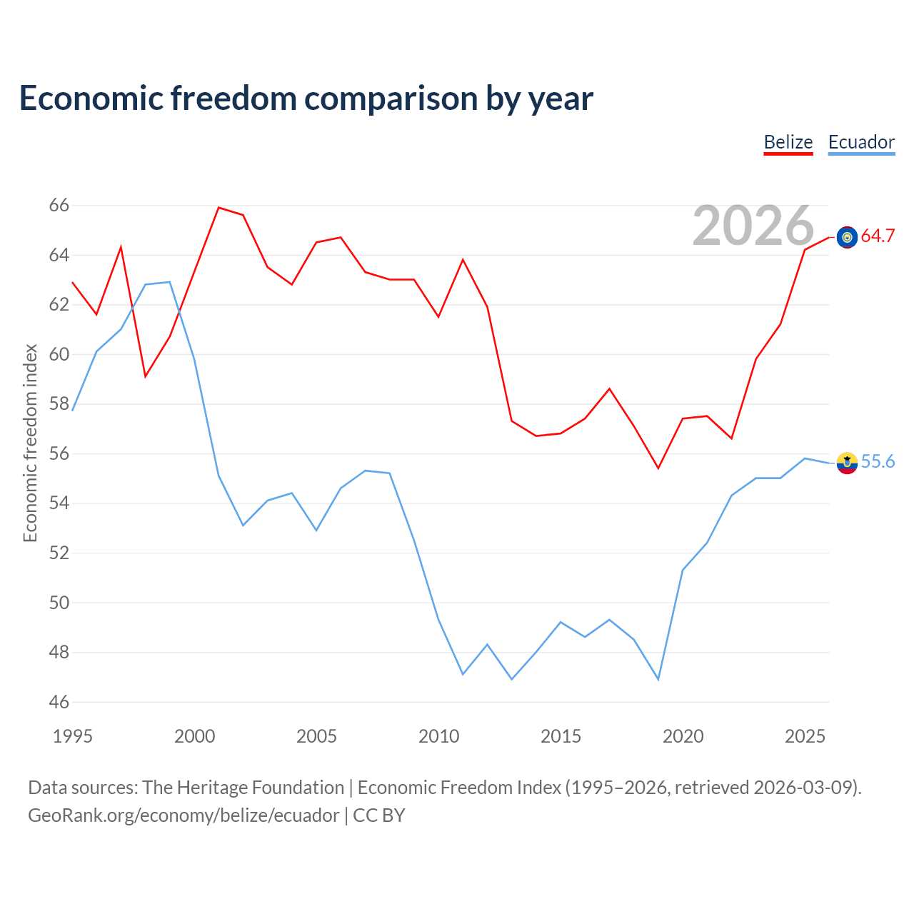 The Economic Freedom Index for Belize is 64.7, ranking 71/197, compared to 55.6 for Ecuador, ranking 127/197. The chart above displays a comparison of annual changes in economic freedom indexes.