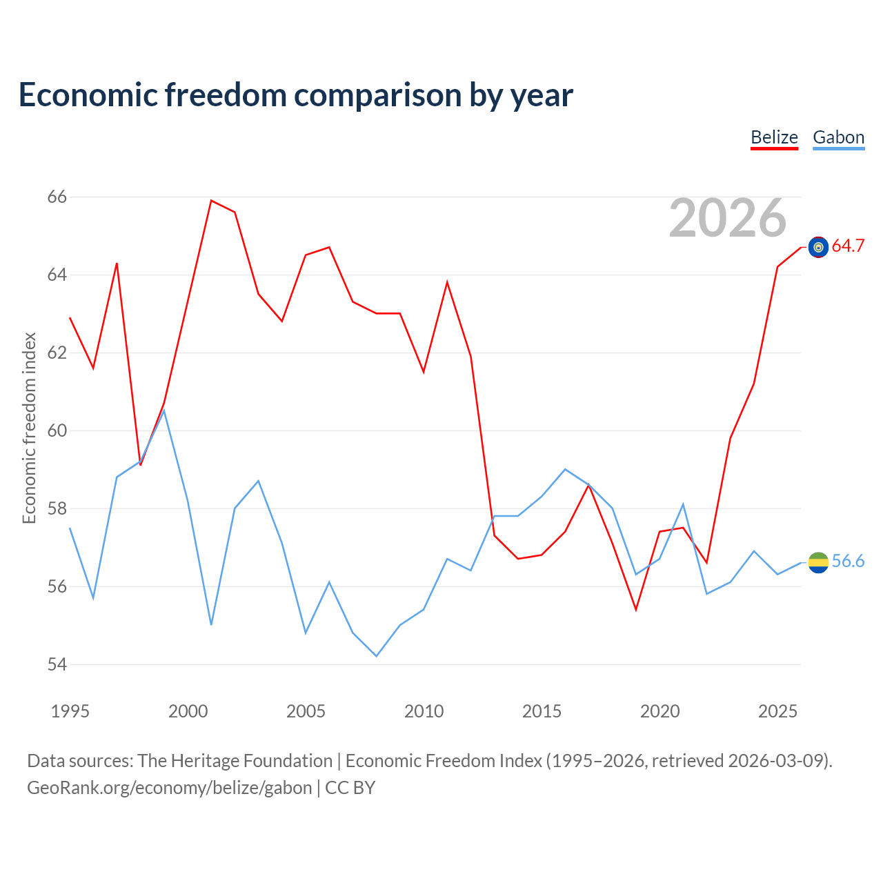 The Economic Freedom Index for Belize is 64.7, ranking 71/197, compared to 56.6 for Gabon, ranking 120/197. The chart above displays a comparison of annual changes in economic freedom indexes.