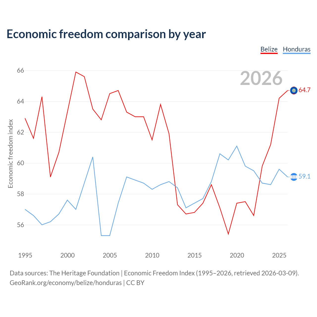 The Economic Freedom Index for Belize is 64.7, ranking 71/197, compared to 59.1 for Honduras, ranking 105/197. The chart above displays a comparison of annual changes in economic freedom indexes.