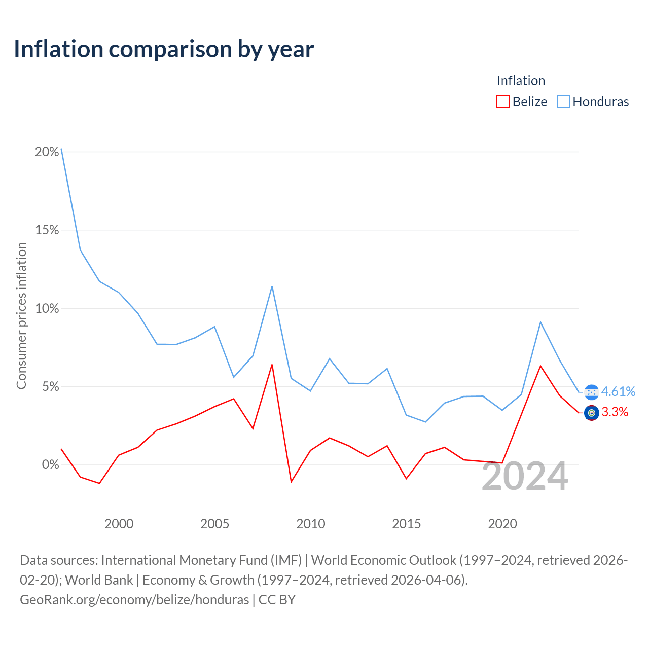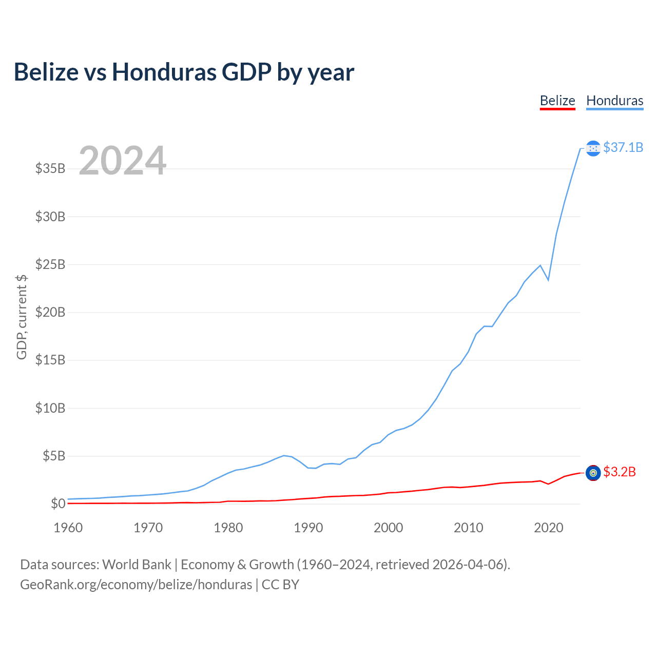 Belize has a GDP of $3.2B compared to $37.1B for Honduras, ranking 168/197 and 104/197 by economy size, respectively.