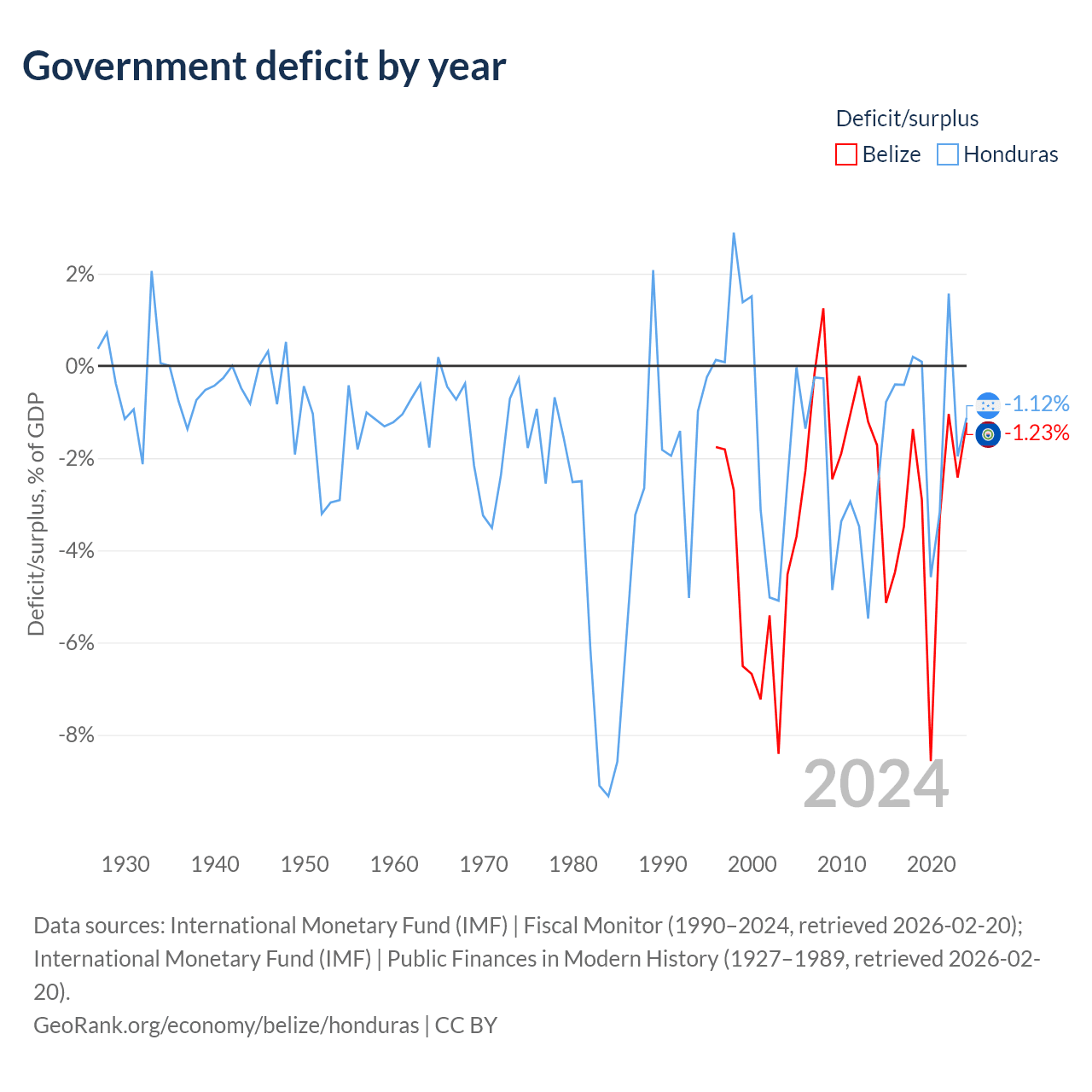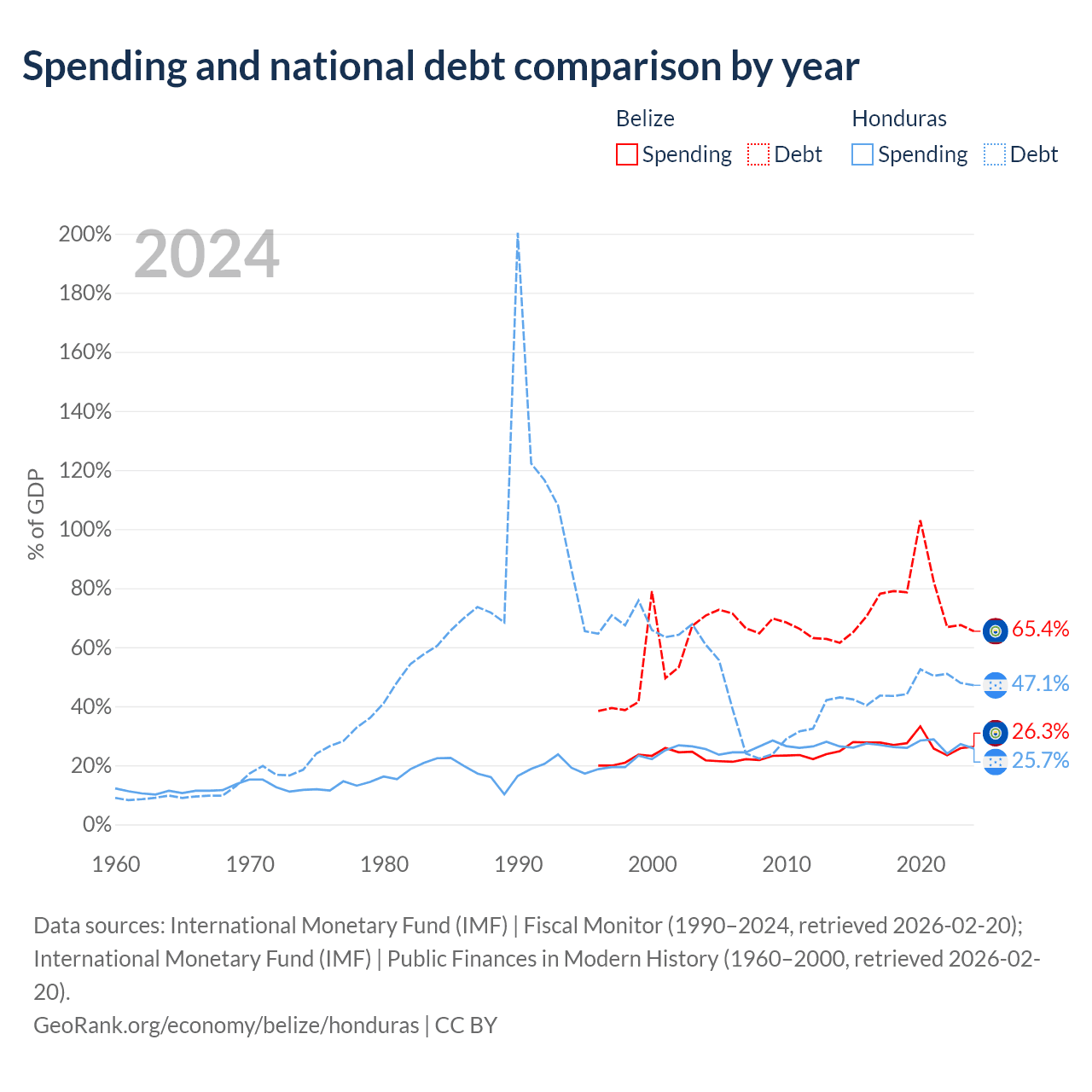 Belize has $2.1B in government debt (65.4% of GDP), compared to $17.5B (47.1% of GDP) in Honduras.