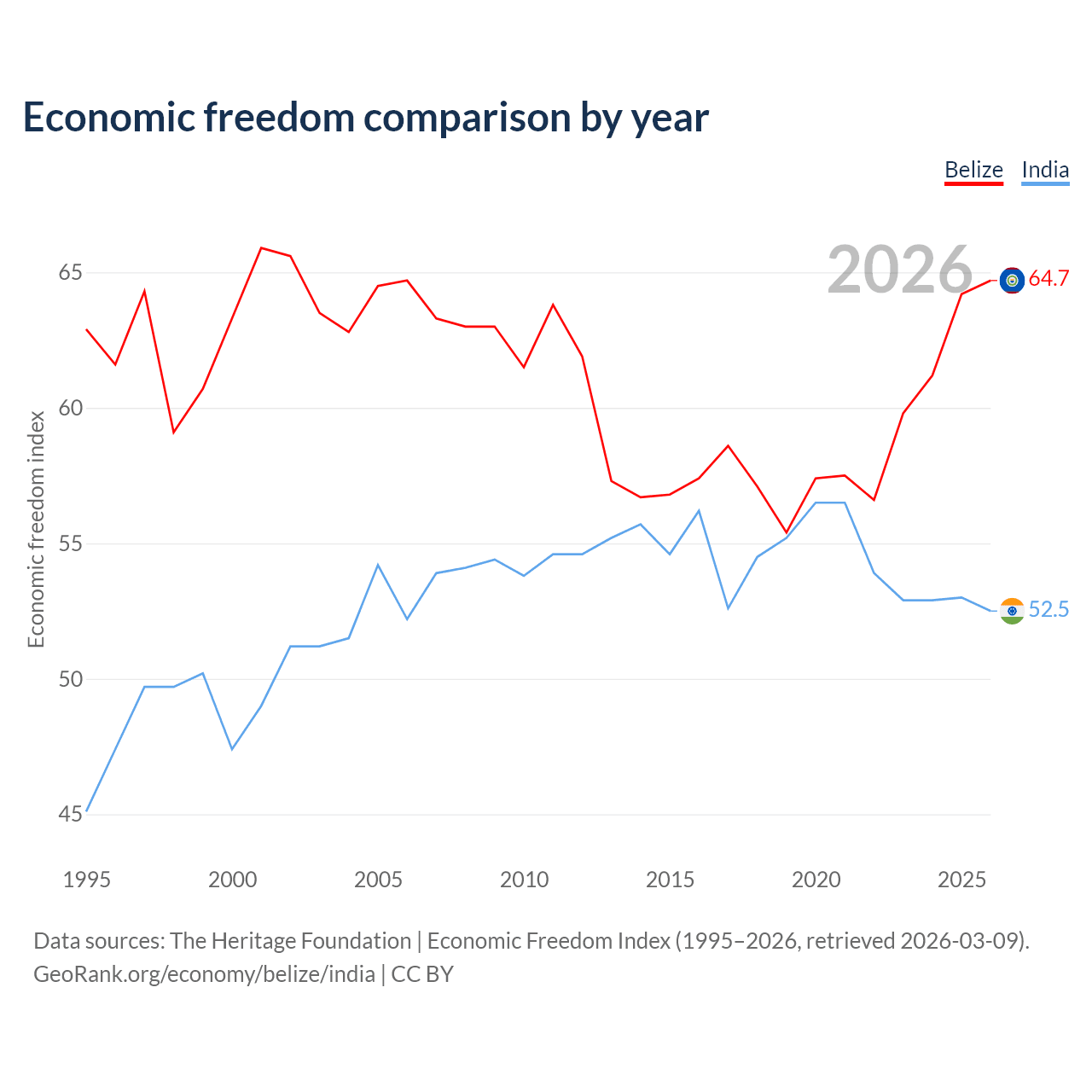 The Economic Freedom Index for Belize is 64.7, ranking 71/197, compared to 52.5 for India, ranking 146/197. The chart above displays a comparison of annual changes in economic freedom indexes.