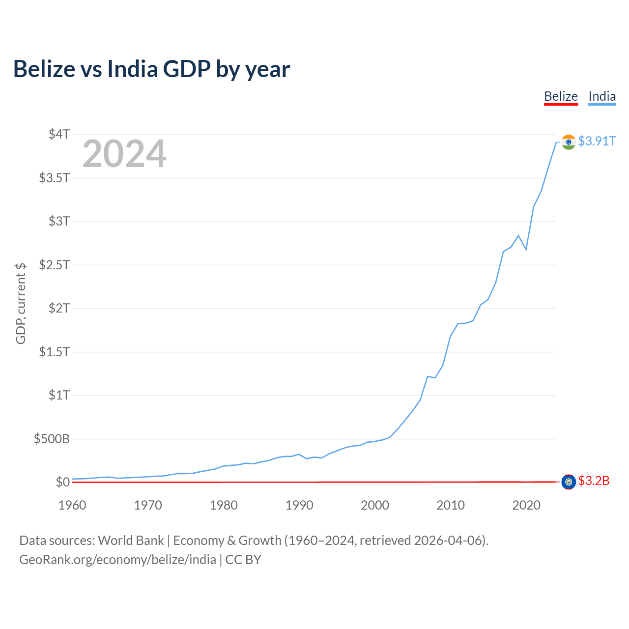 Belize has a GDP of $3.2B compared to $3.91T for India, ranking 168/197 and 5/197 by economy size, respectively.
