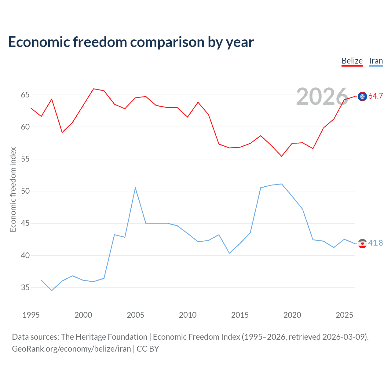 The Economic Freedom Index for Belize is 64.7, ranking 71/197, compared to 41.8 for Iran, ranking 185/197. The chart above displays a comparison of annual changes in economic freedom indexes.