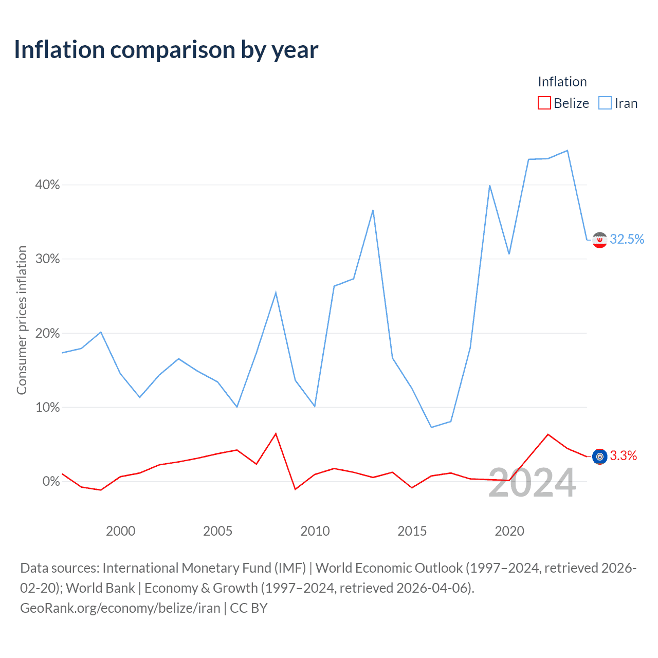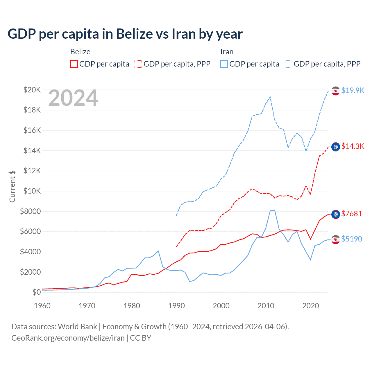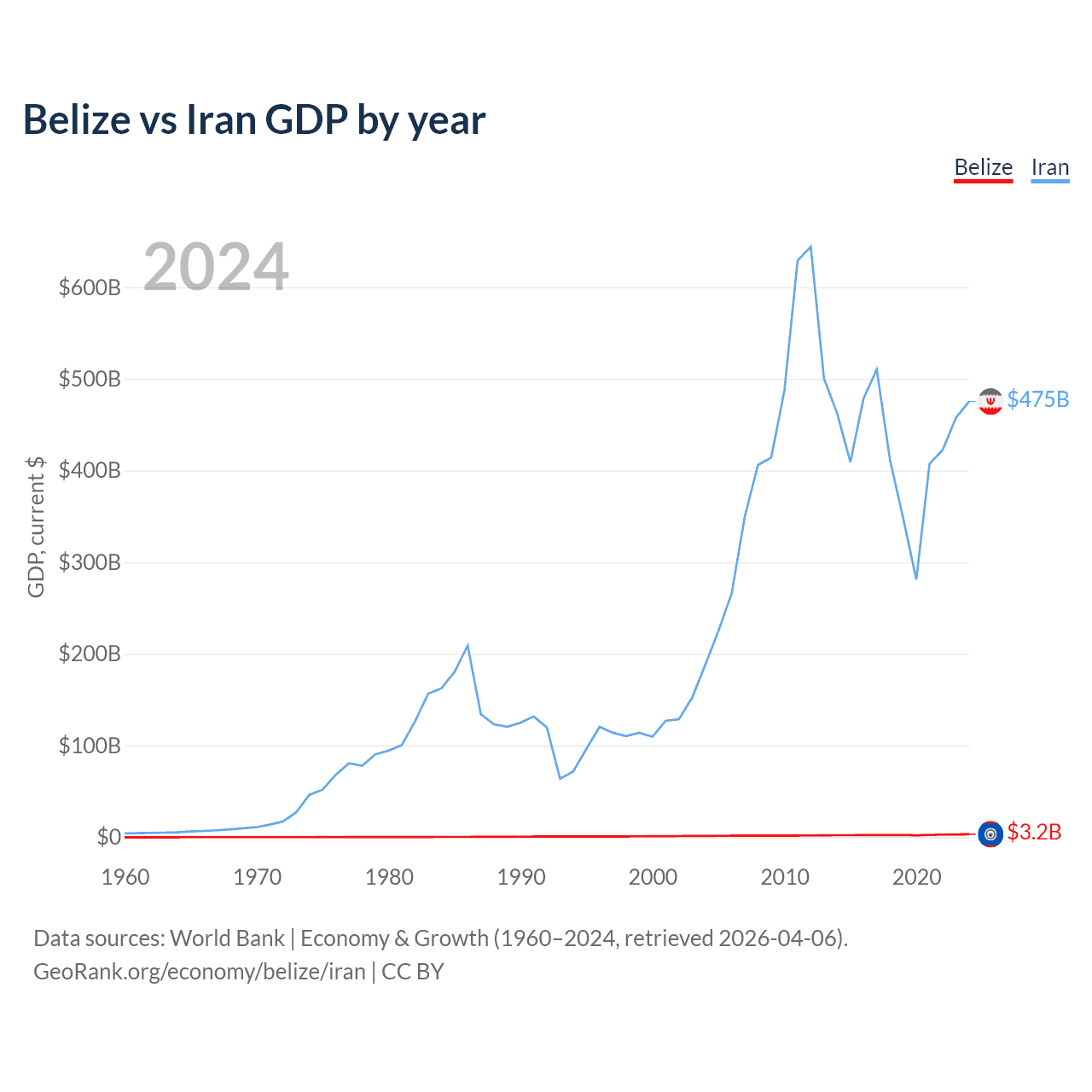 Belize has a GDP of $3.2B compared to $475B for Iran, ranking 168/197 and 34/197 by economy size, respectively.