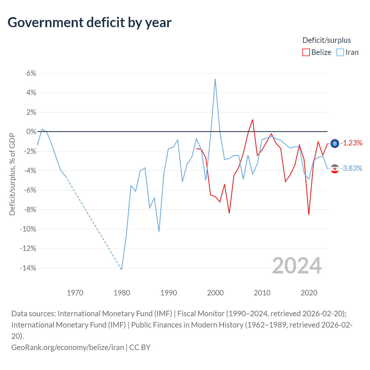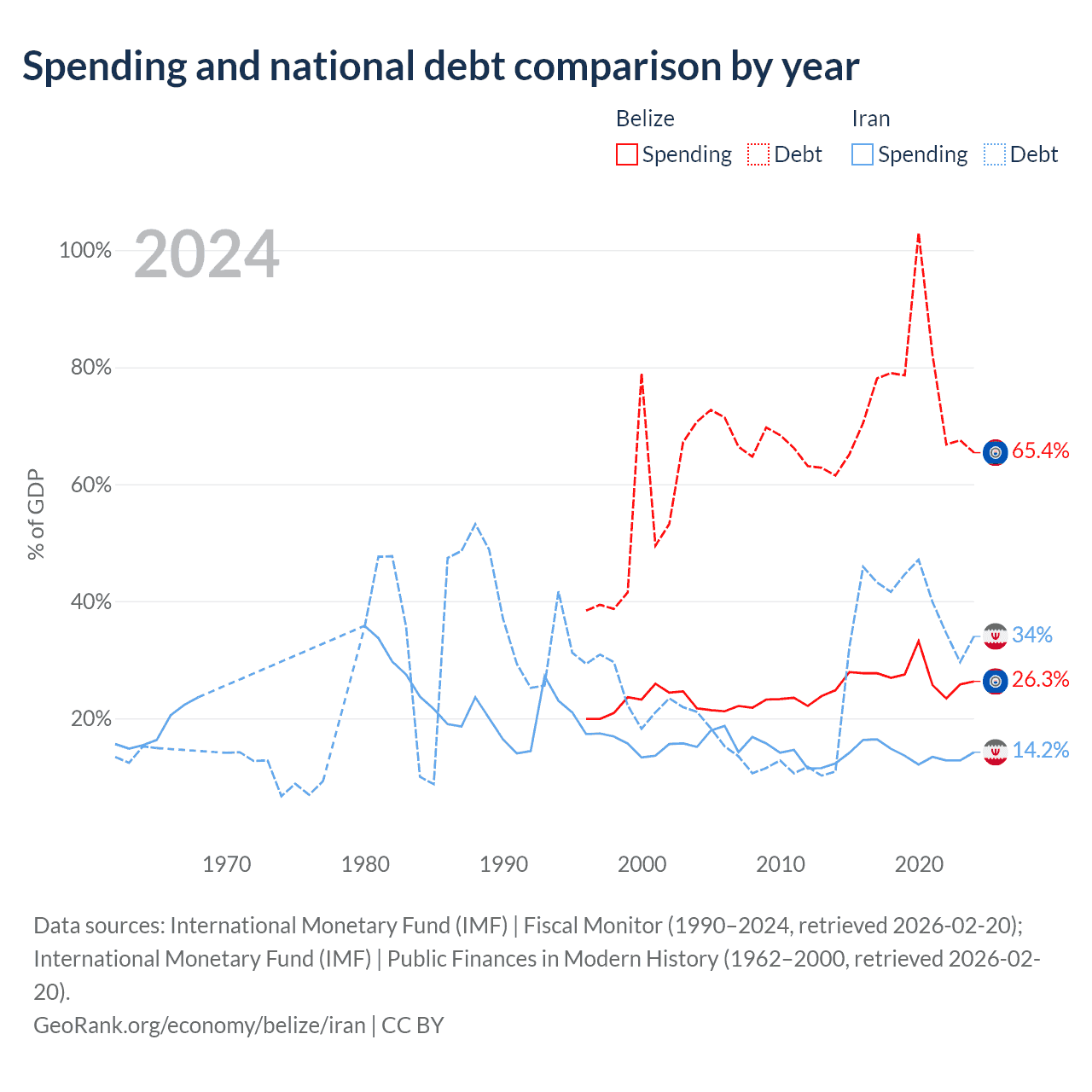Belize has $2.1B in government debt (65.4% of GDP), compared to $162B (34% of GDP) in Iran.