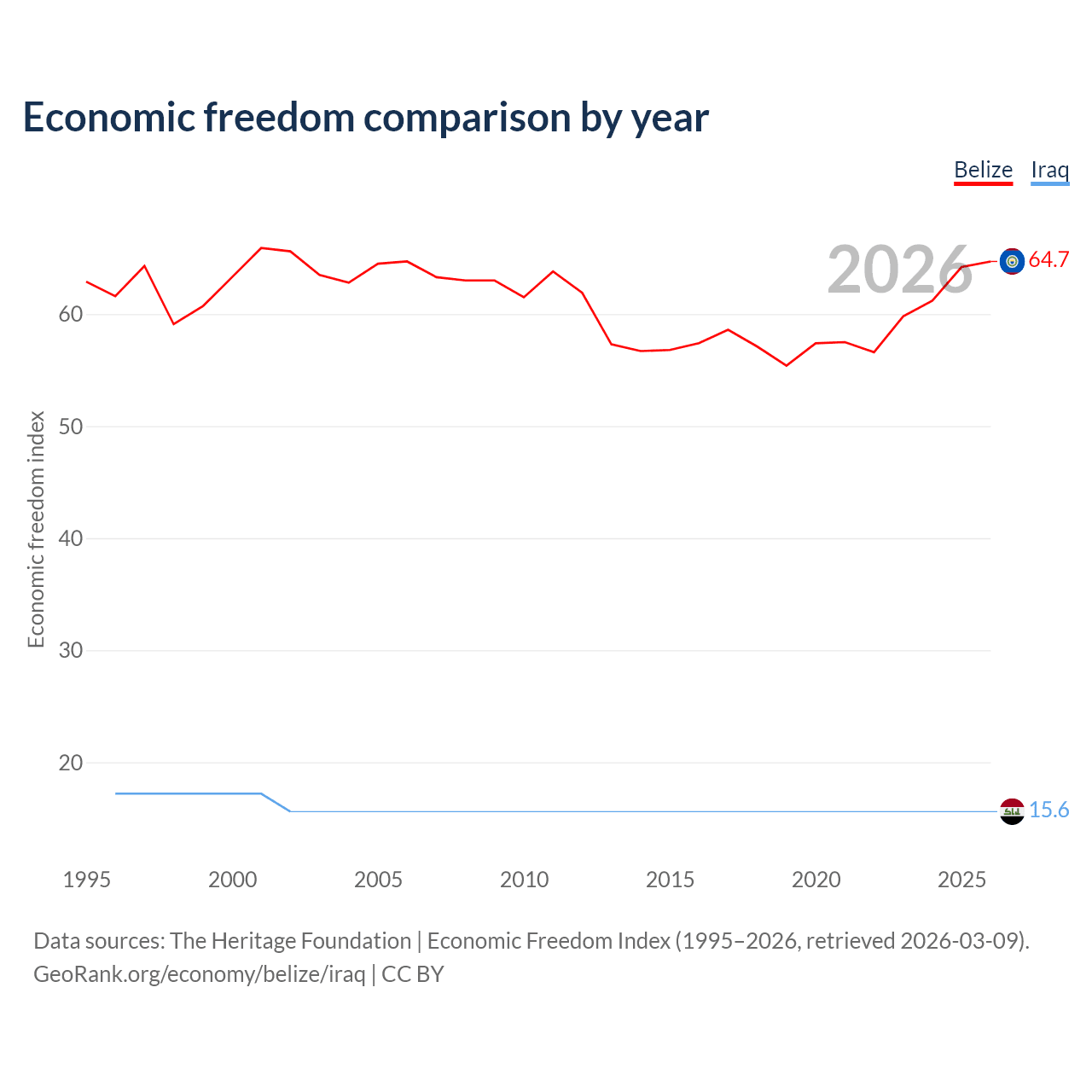 The Economic Freedom Index for Belize is 64.7, ranking 71/197, compared to 15.6 for Iraq, ranking 196/197. The chart above displays a comparison of annual changes in economic freedom indexes.