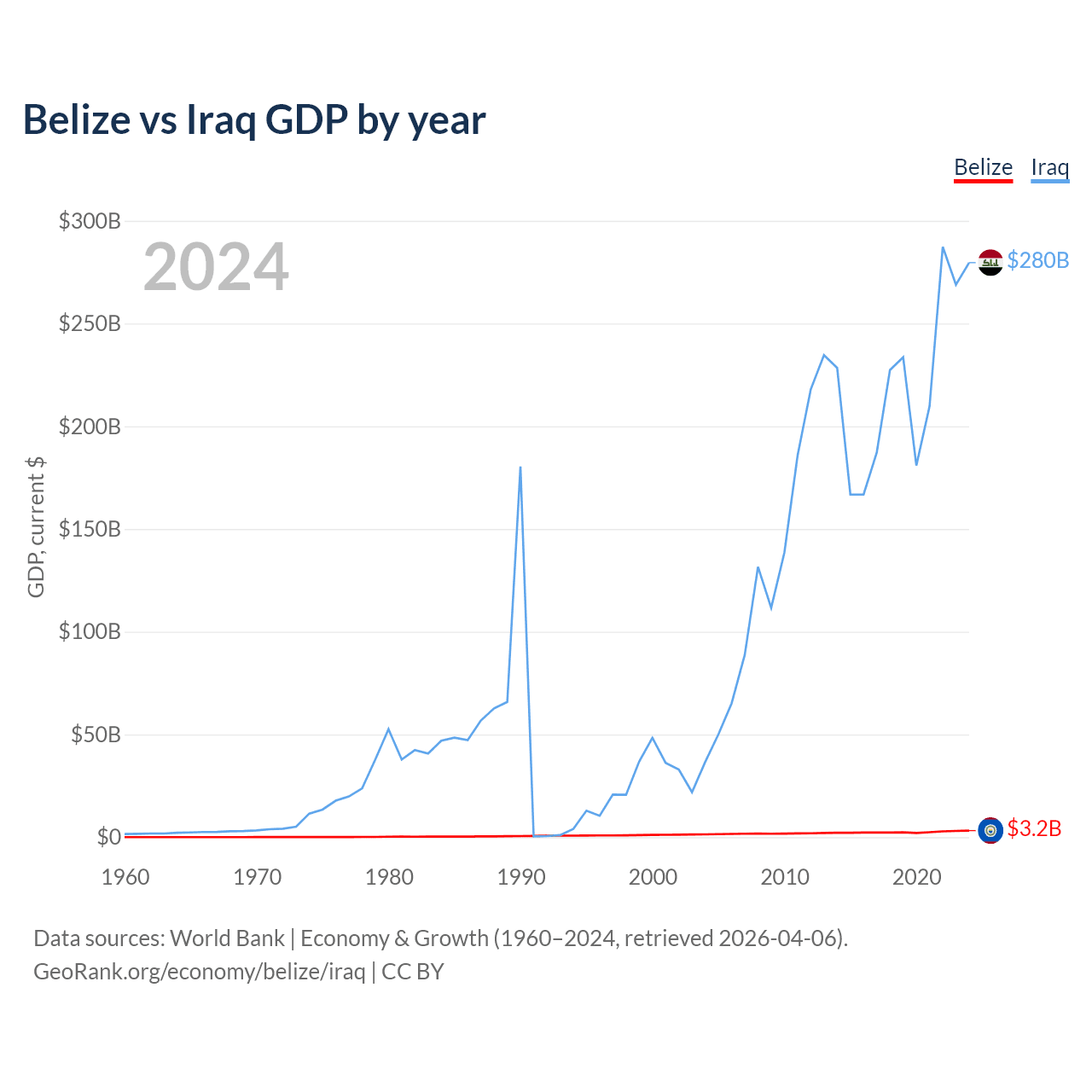 Belize has a GDP of $3.2B compared to $280B for Iraq, ranking 168/197 and 50/197 by economy size, respectively.