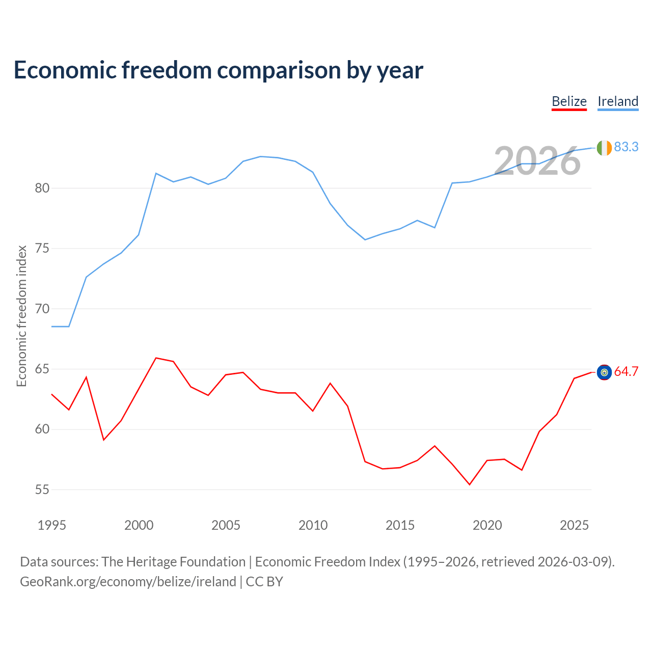 The Economic Freedom Index for Belize is 64.7, ranking 71/197, compared to 83.3 for Ireland, ranking 3/197. The chart above displays a comparison of annual changes in economic freedom indexes.