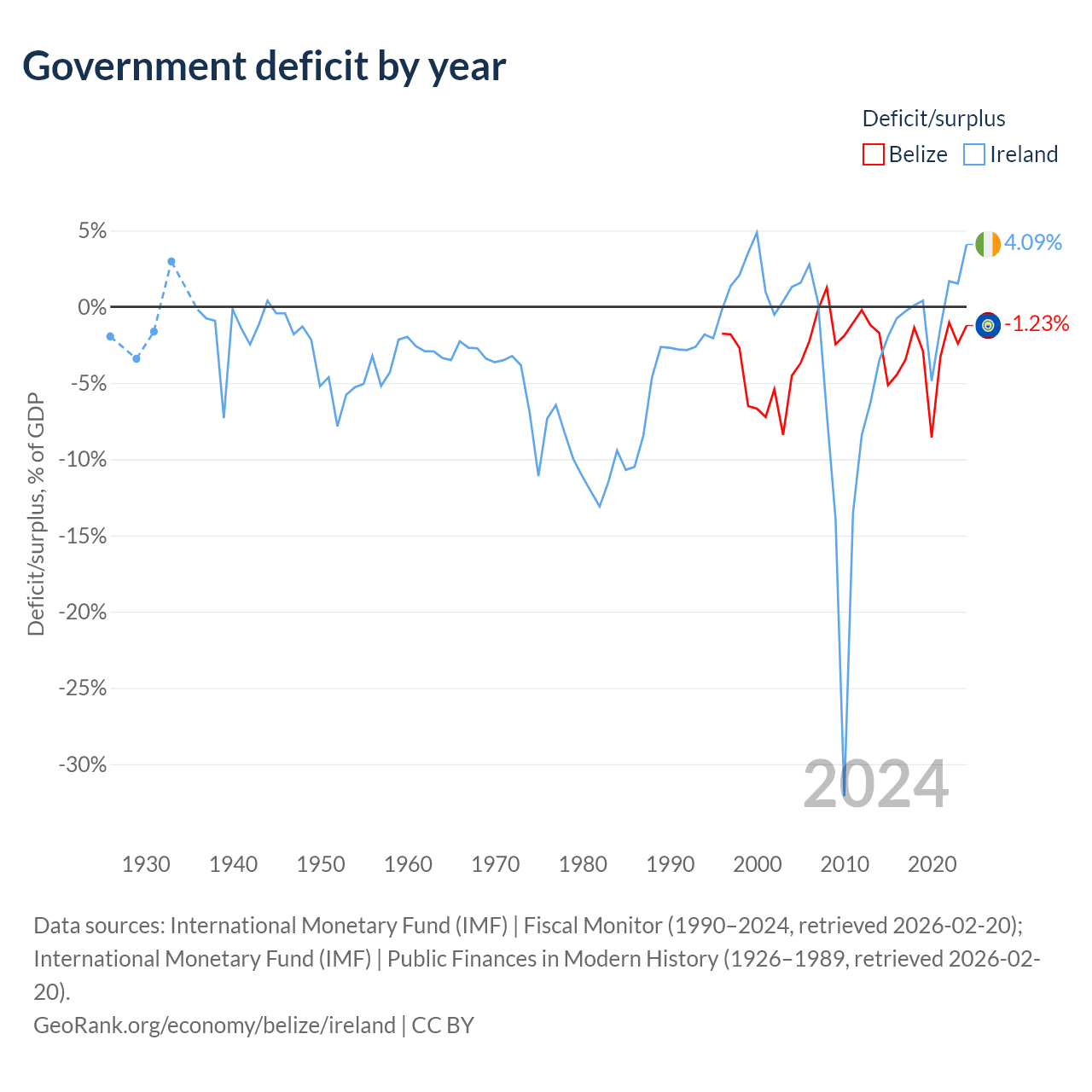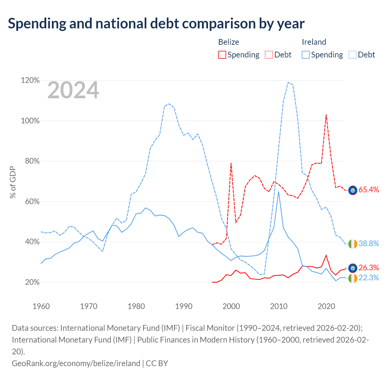 Belize has $2.1B in government debt (65.4% of GDP), compared to $236B (38.8% of GDP) in Ireland.