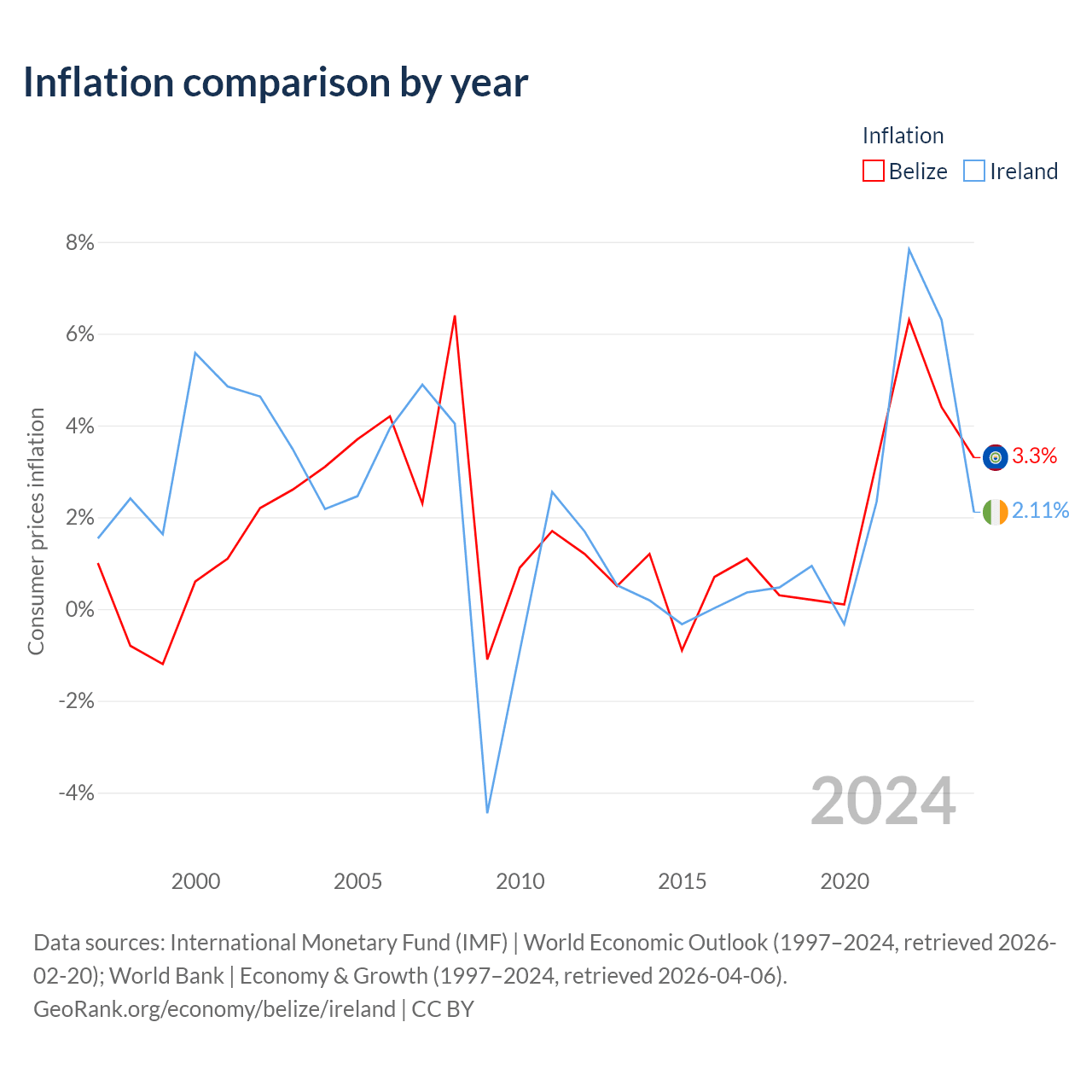 Belize has a GDP of $3.2B compared to $609B for Ireland, ranking 168/197 and 25/197 by economy size, respectively.