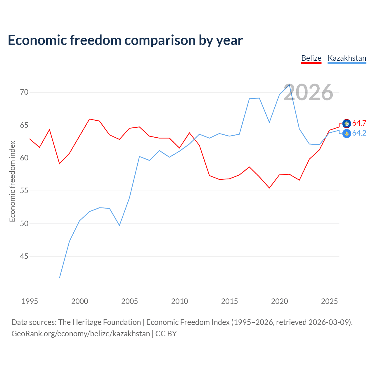 The Economic Freedom Index for Belize is 64.7, ranking 71/197, compared to 64.2 for Kazakhstan, ranking 75/197. The chart above displays a comparison of annual changes in economic freedom indexes.