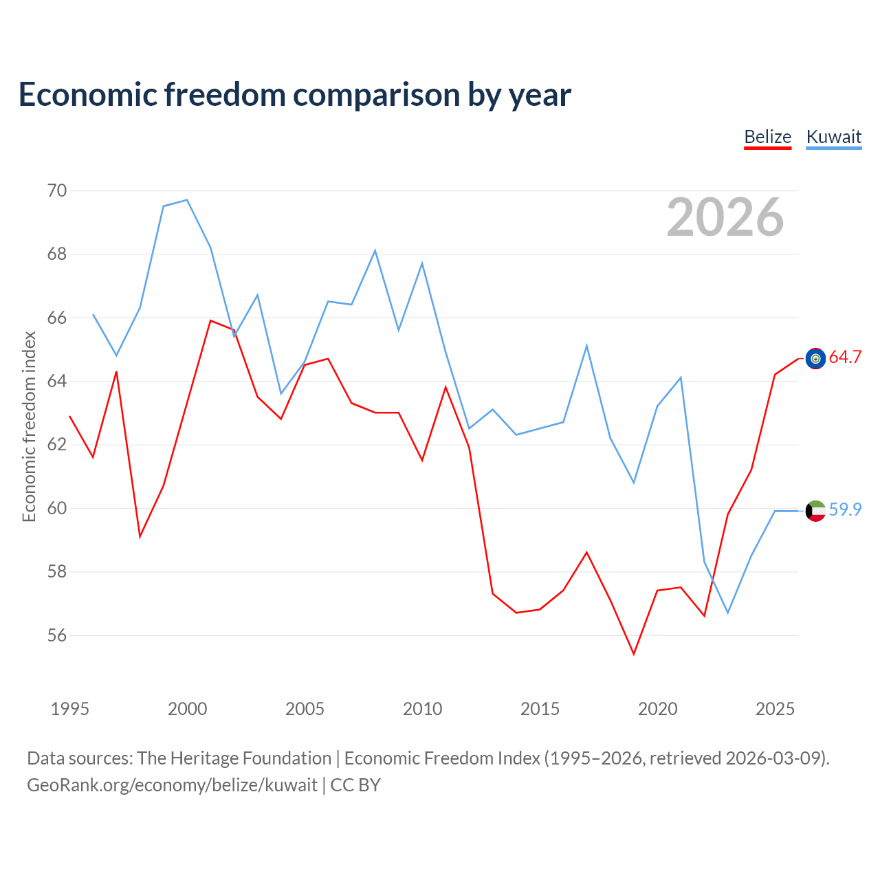 The Economic Freedom Index for Belize is 64.7, ranking 71/197, compared to 59.9 for Kuwait, ranking 100/197. The chart above displays a comparison of annual changes in economic freedom indexes.