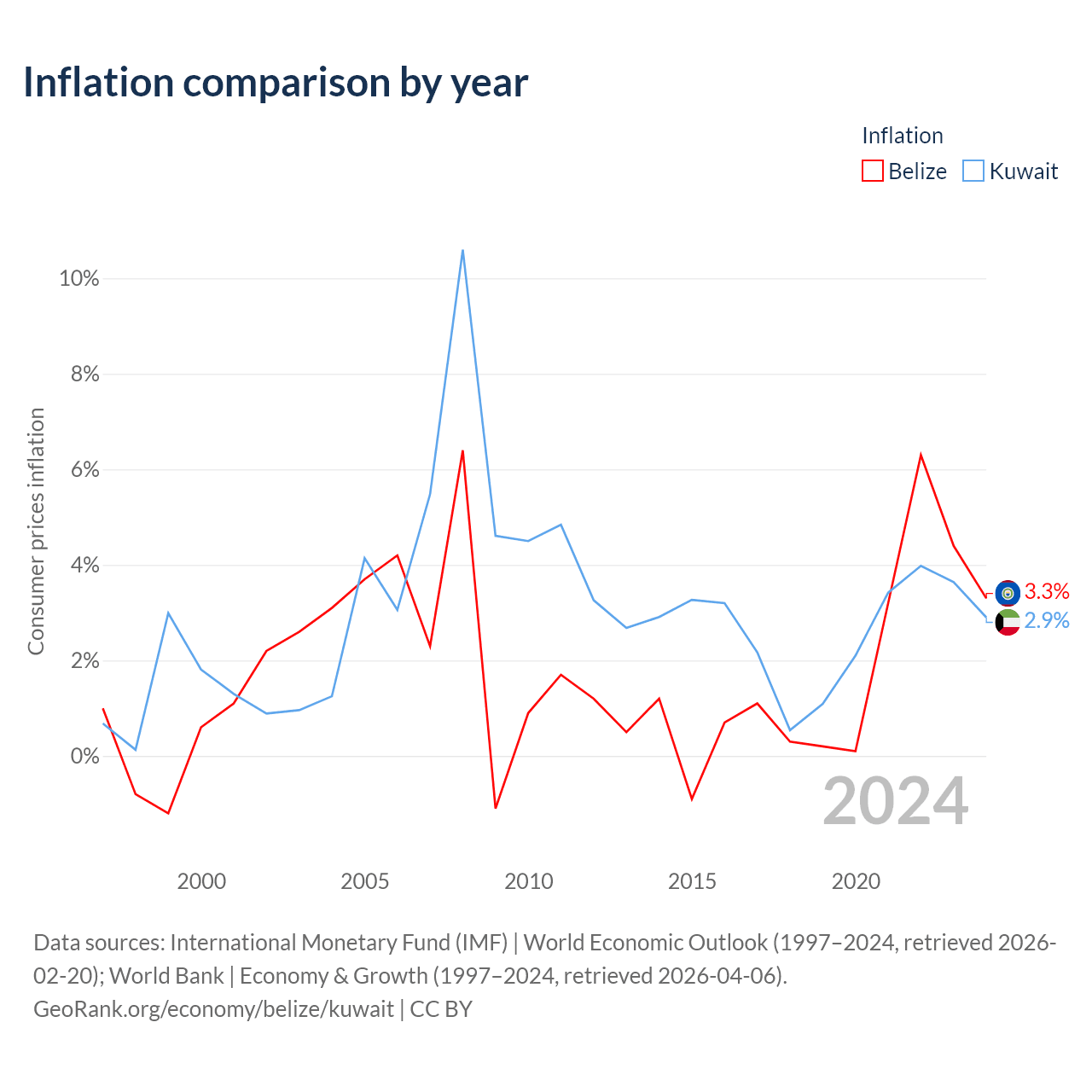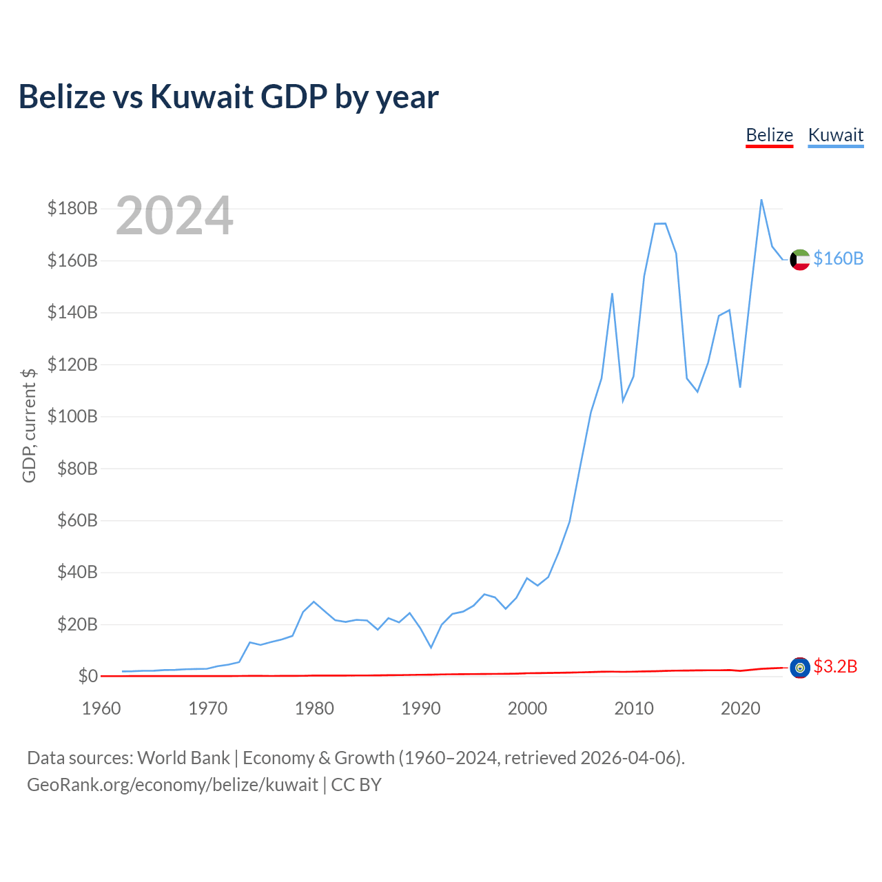 Belize has a GDP of $3.2B compared to $160B for Kuwait, ranking 168/197 and 59/197 by economy size, respectively.