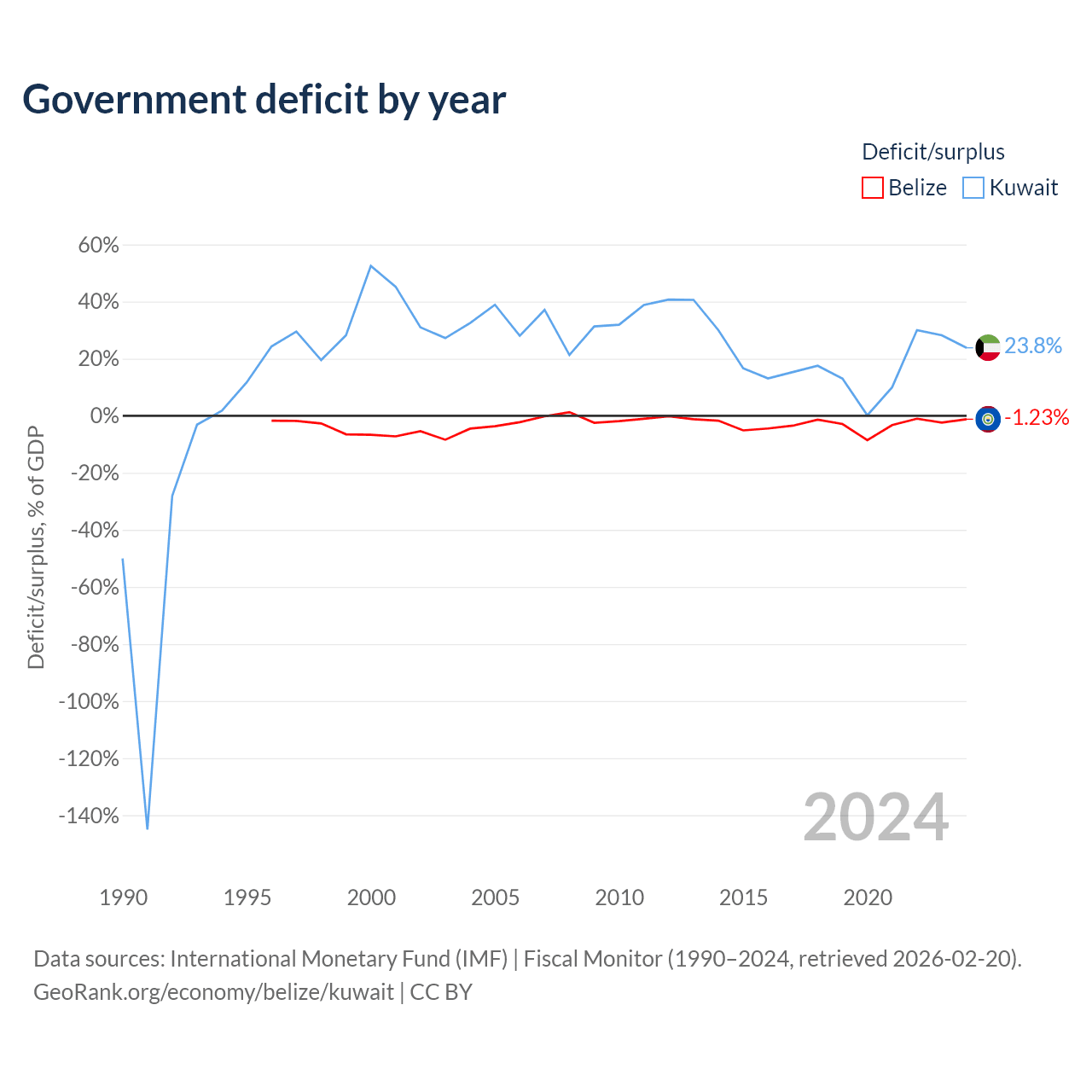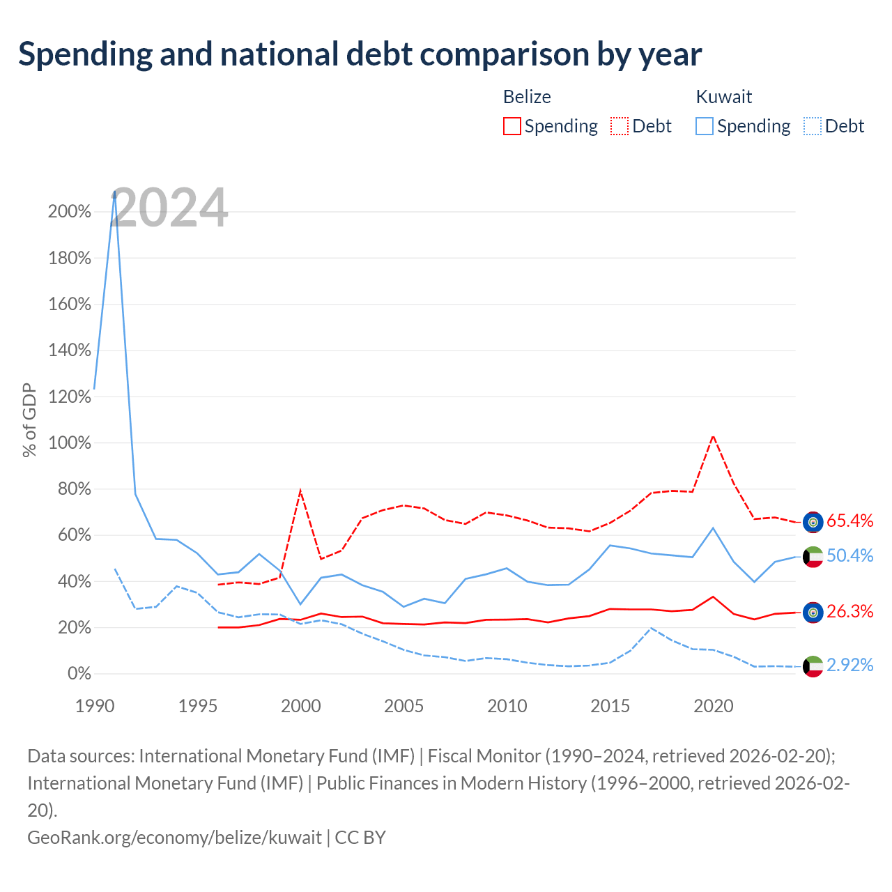 Belize has $2.1B in government debt (65.4% of GDP), compared to $4.68B (2.92% of GDP) in Kuwait.
