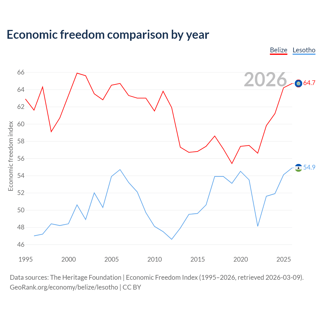 The Economic Freedom Index for Belize is 64.7, ranking 71/197, compared to 54.9 for Lesotho, ranking 130/197. The chart above displays a comparison of annual changes in economic freedom indexes.
