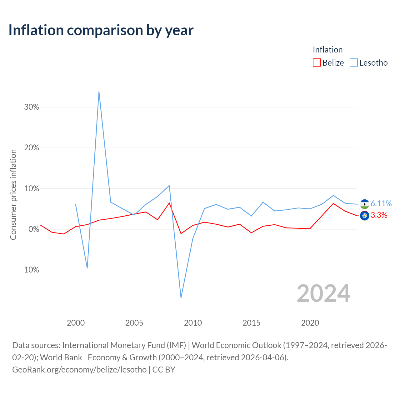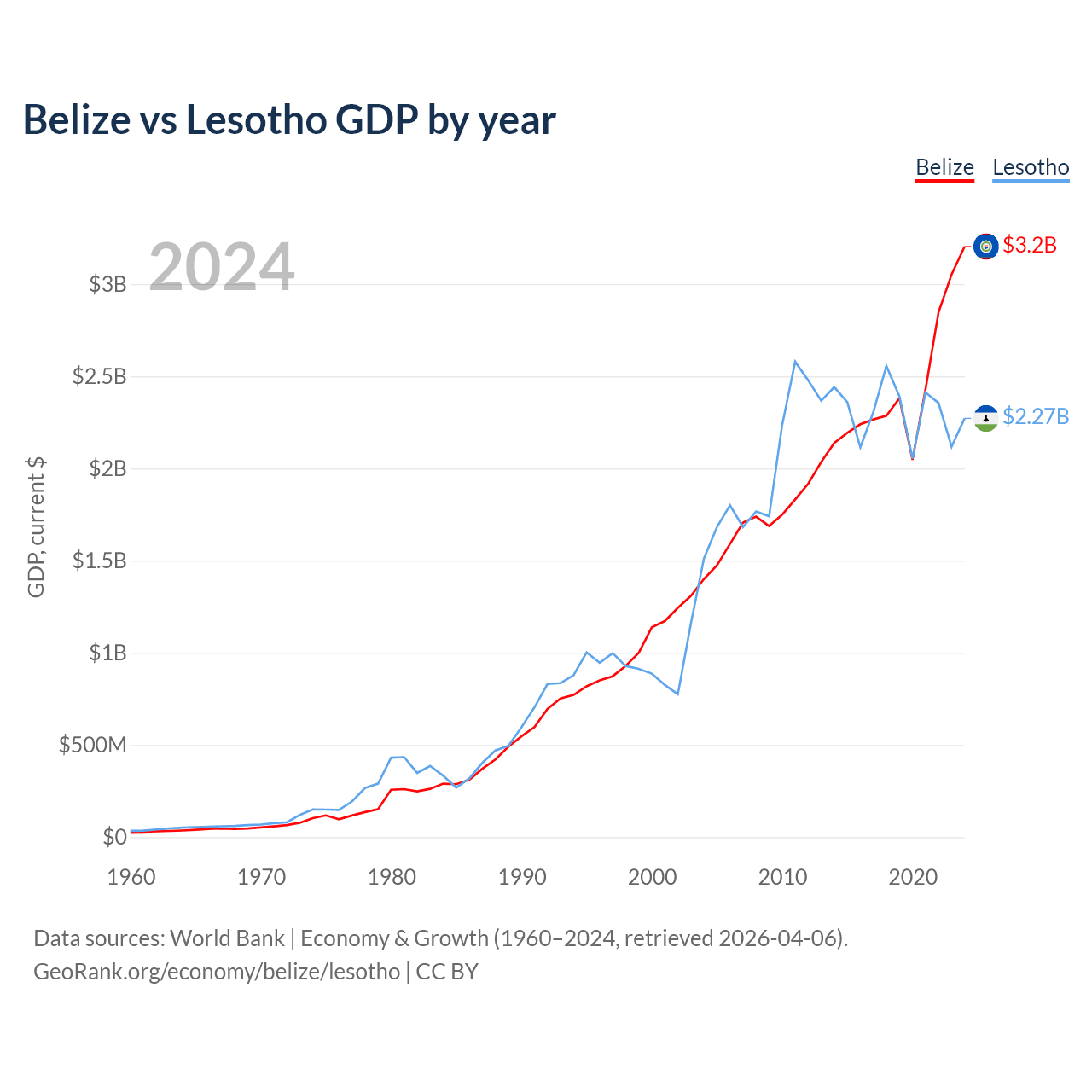 Belize has a GDP of $3.2B compared to $2.27B for Lesotho, ranking 168/197 and 175/197 by economy size, respectively.