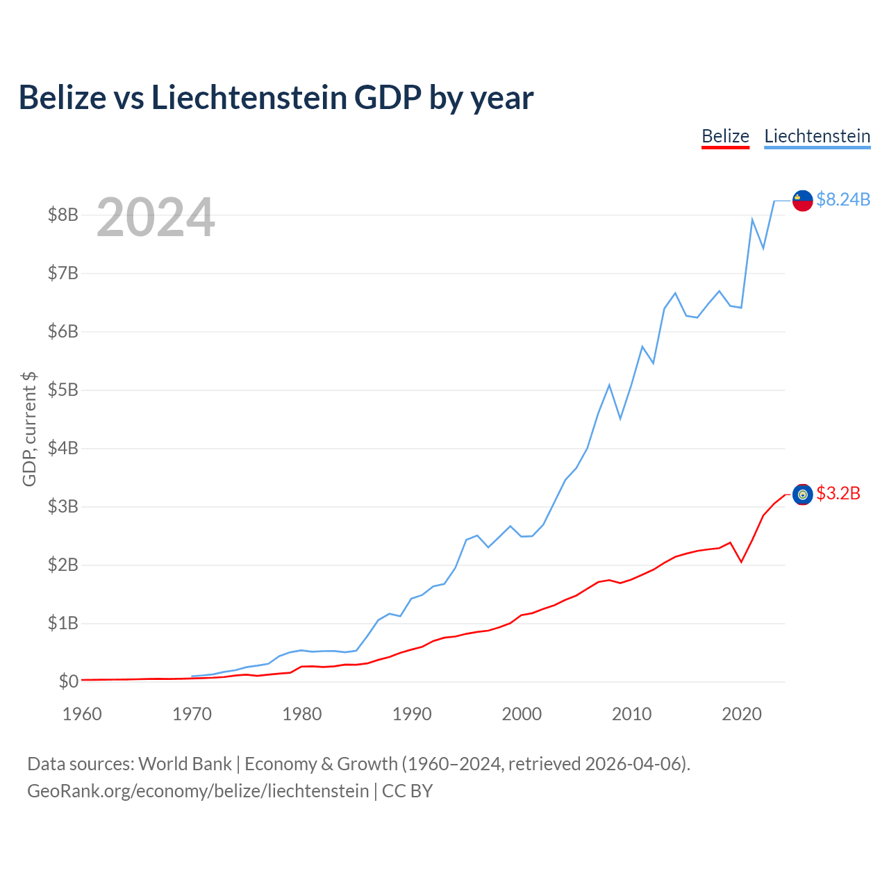 Belize has a GDP of $3.2B compared to $8.24B for Liechtenstein, ranking 168/197 and 156/197 by economy size, respectively.