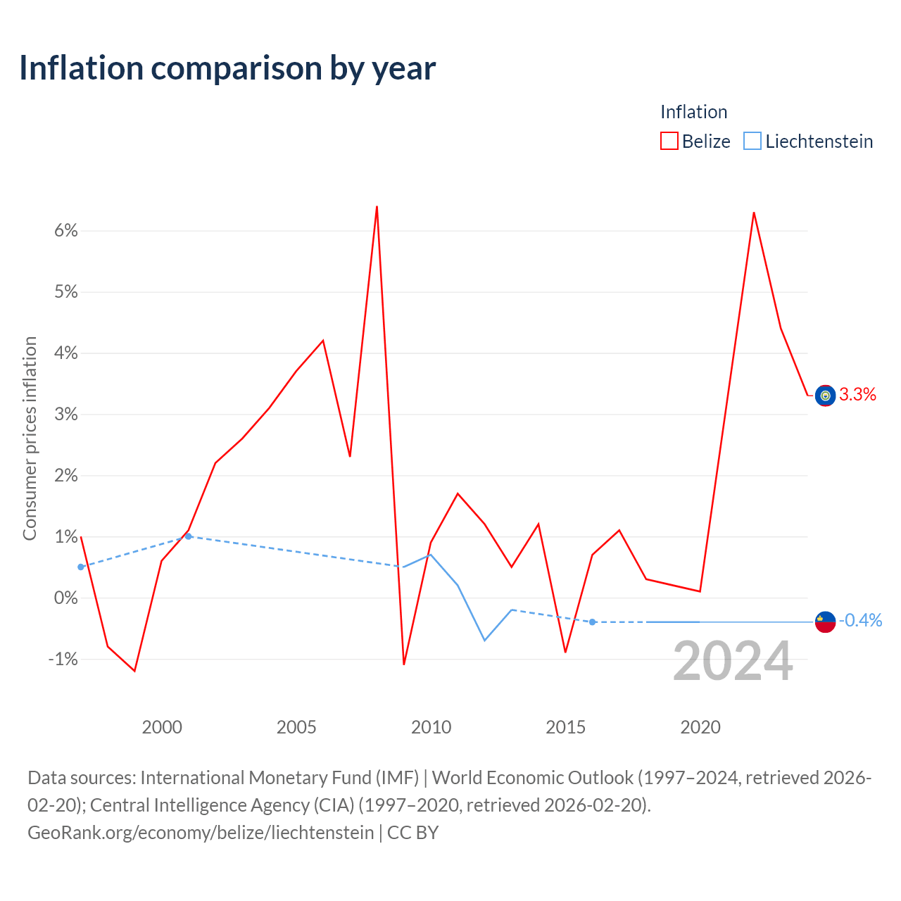 Over the past 24 years, Belize has recorded an average annual inflation rate of 1.3%, compared with 0.04% in Liechtenstein. In 2020, inflation was 3.3% in Belize and -0.4% in Liechtenstein.