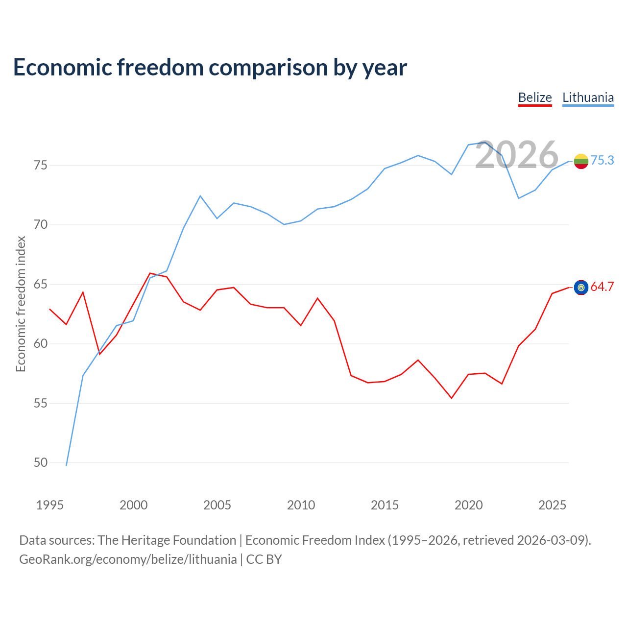 The Economic Freedom Index for Belize is 64.7, ranking 71/197, compared to 75.3 for Lithuania, ranking 18/197. The chart above displays a comparison of annual changes in economic freedom indexes.