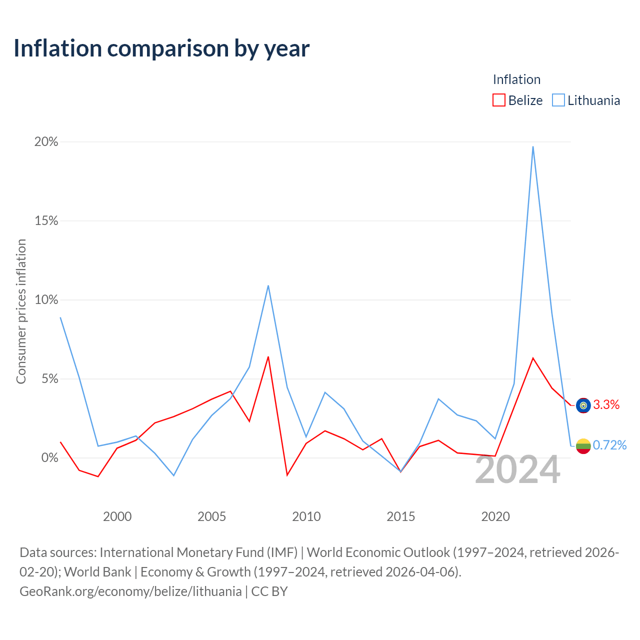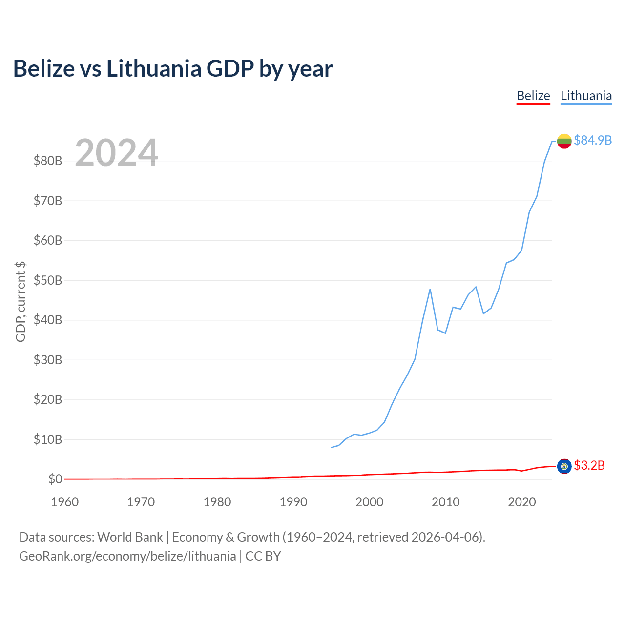 Belize has a GDP of $3.2B compared to $84.9B for Lithuania, ranking 168/197 and 79/197 by economy size, respectively.