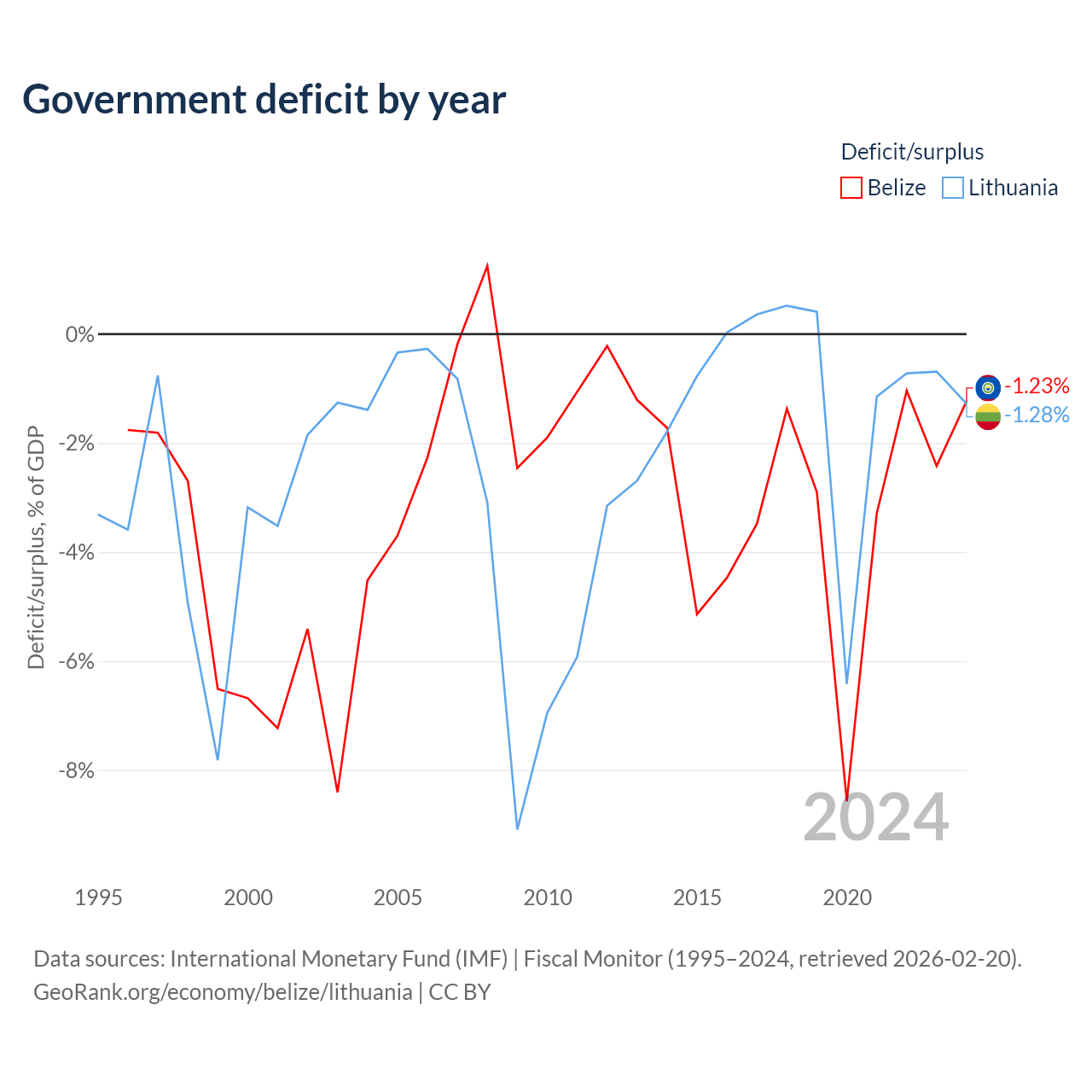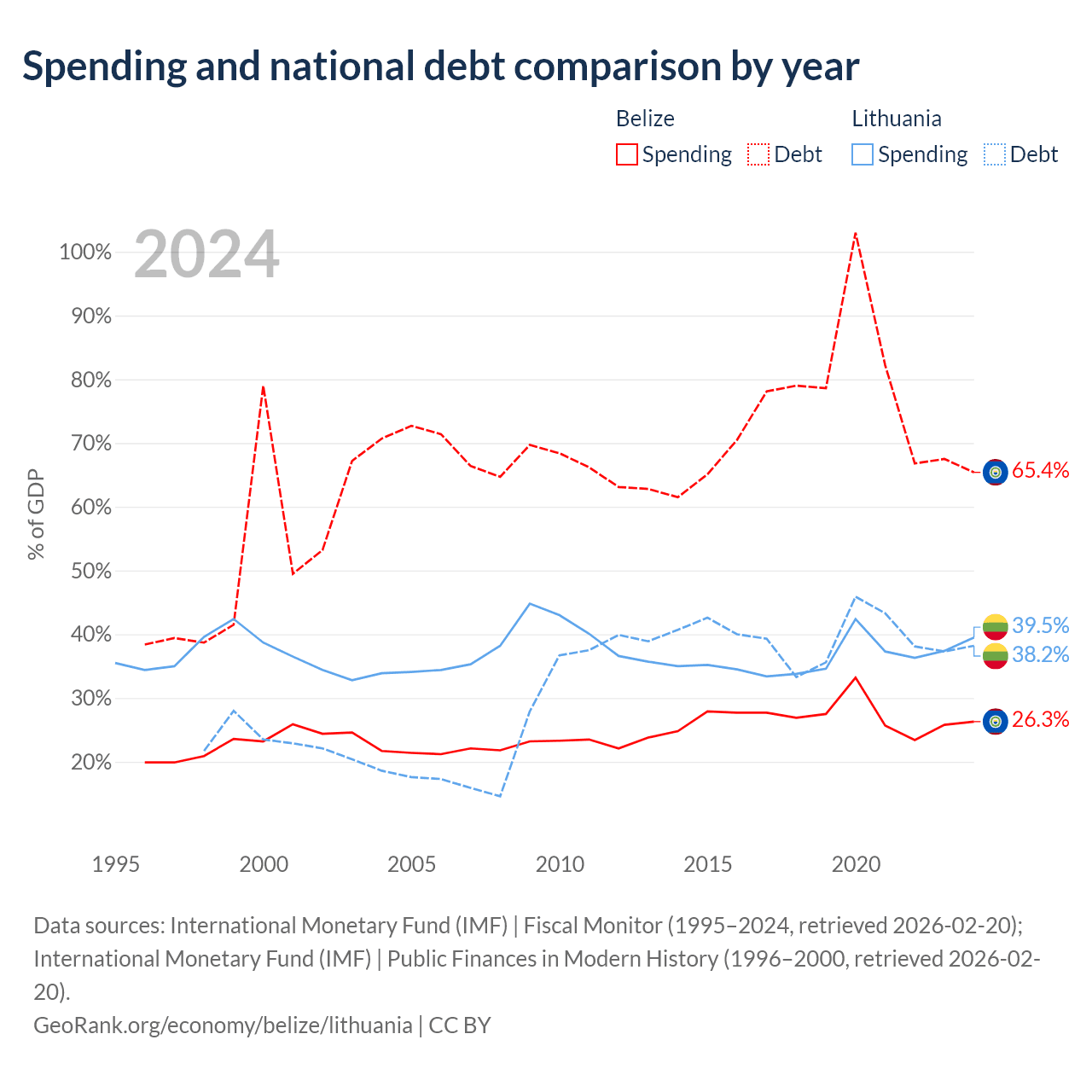 Belize has $2.1B in government debt (65.4% of GDP), compared to $32.4B (38.2% of GDP) in Lithuania.