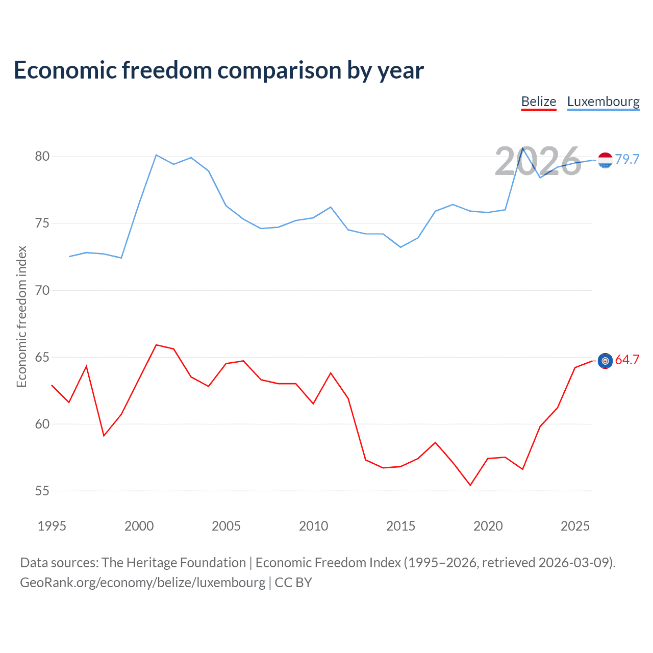 The Economic Freedom Index for Belize is 64.7, ranking 71/197, compared to 79.7 for Luxembourg, ranking 7/197. The chart above displays a comparison of annual changes in economic freedom indexes.