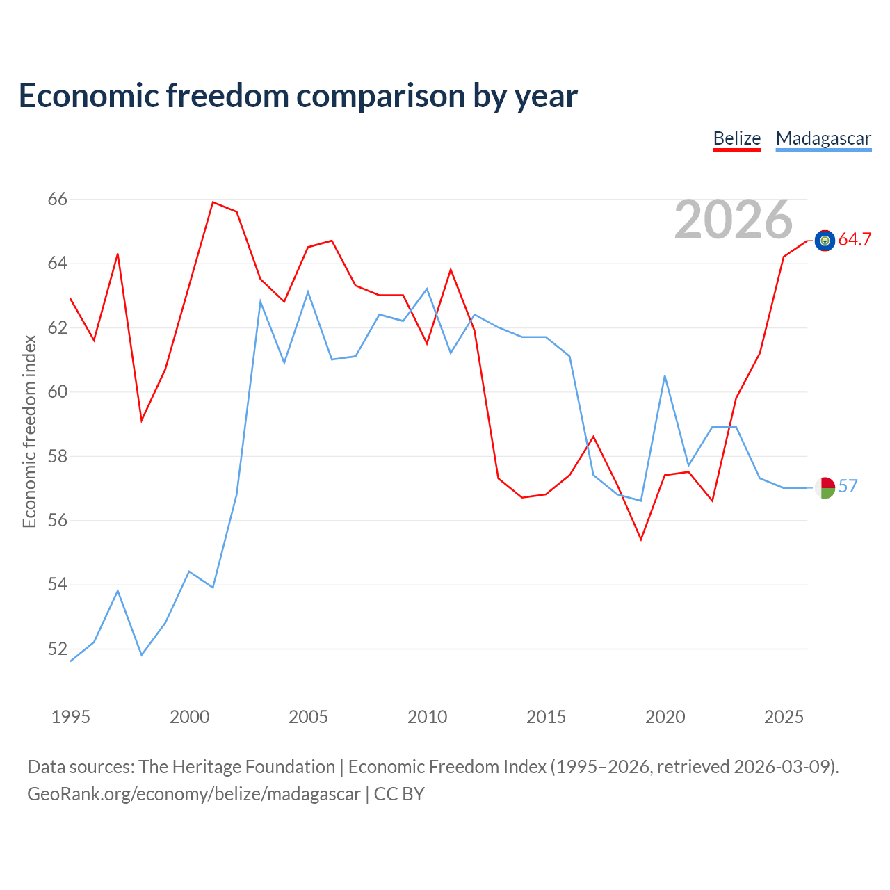 The Economic Freedom Index for Belize is 64.7, ranking 71/197, compared to 57 for Madagascar, ranking 119/197. The chart above displays a comparison of annual changes in economic freedom indexes.