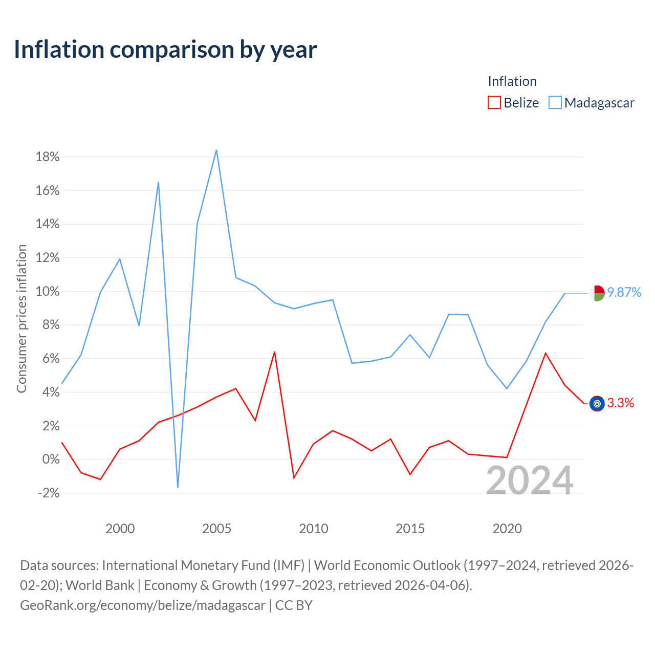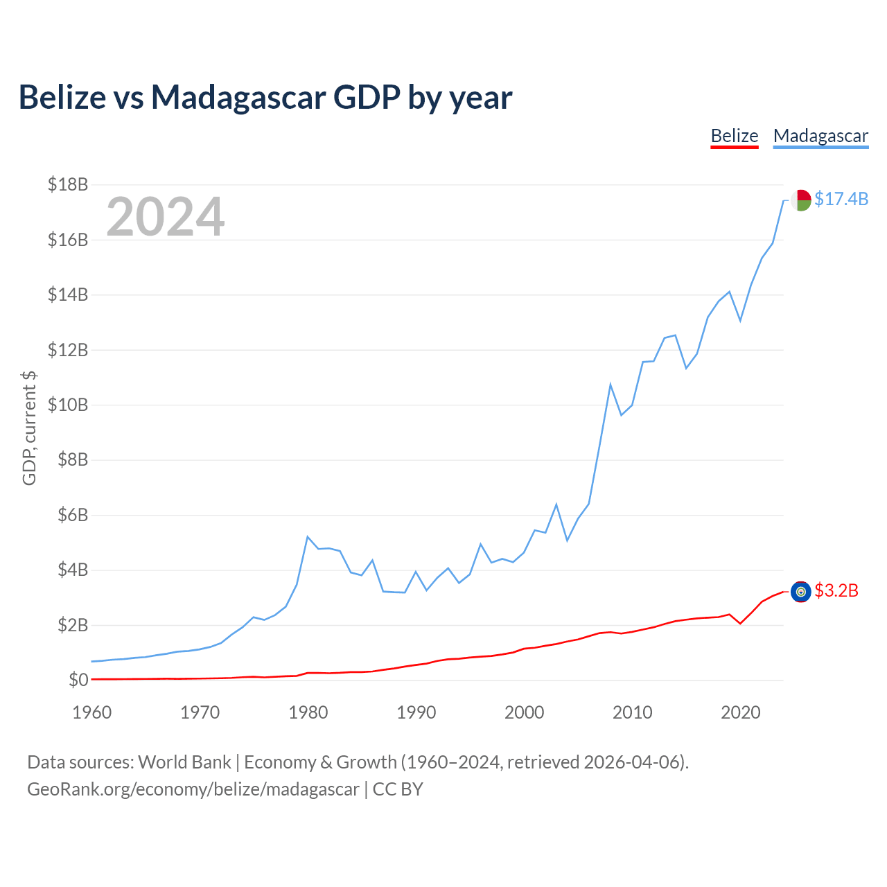 Belize has a GDP of $3.2B compared to $17.4B for Madagascar, ranking 168/197 and 136/197 by economy size, respectively.