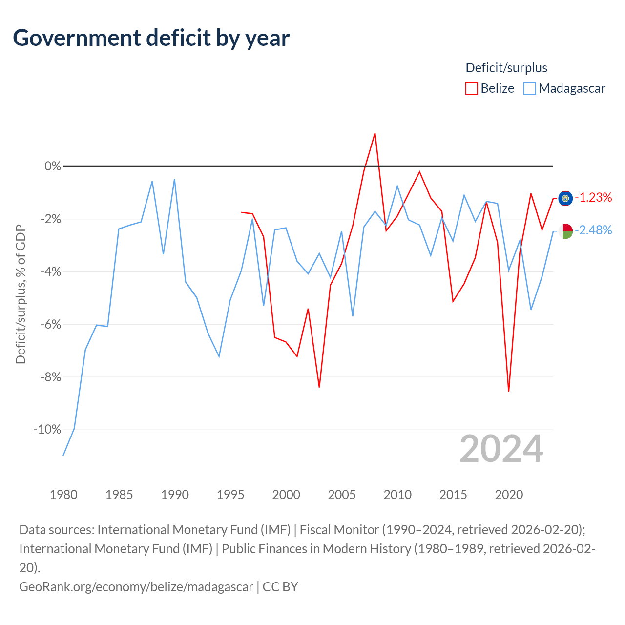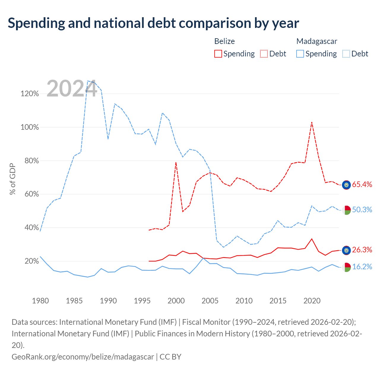 Belize has $2.1B in government debt (65.4% of GDP), compared to $8.77B (50.3% of GDP) in Madagascar.