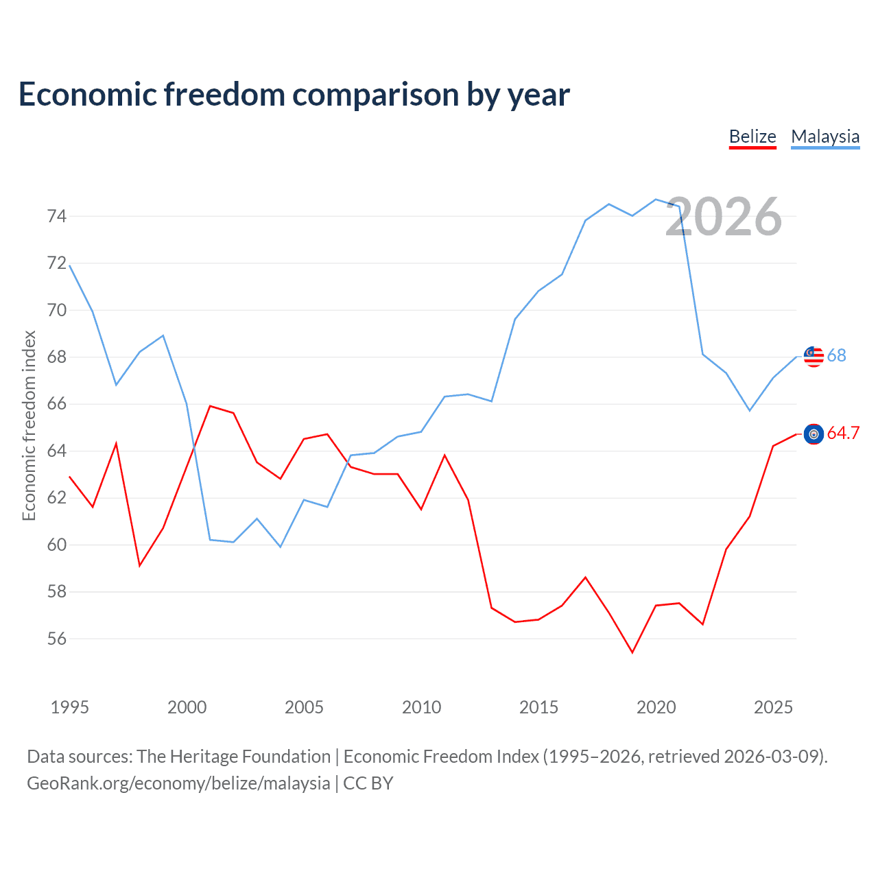 The Economic Freedom Index for Belize is 64.7, ranking 71/197, compared to 68 for Malaysia, ranking 51/197. The chart above displays a comparison of annual changes in economic freedom indexes.