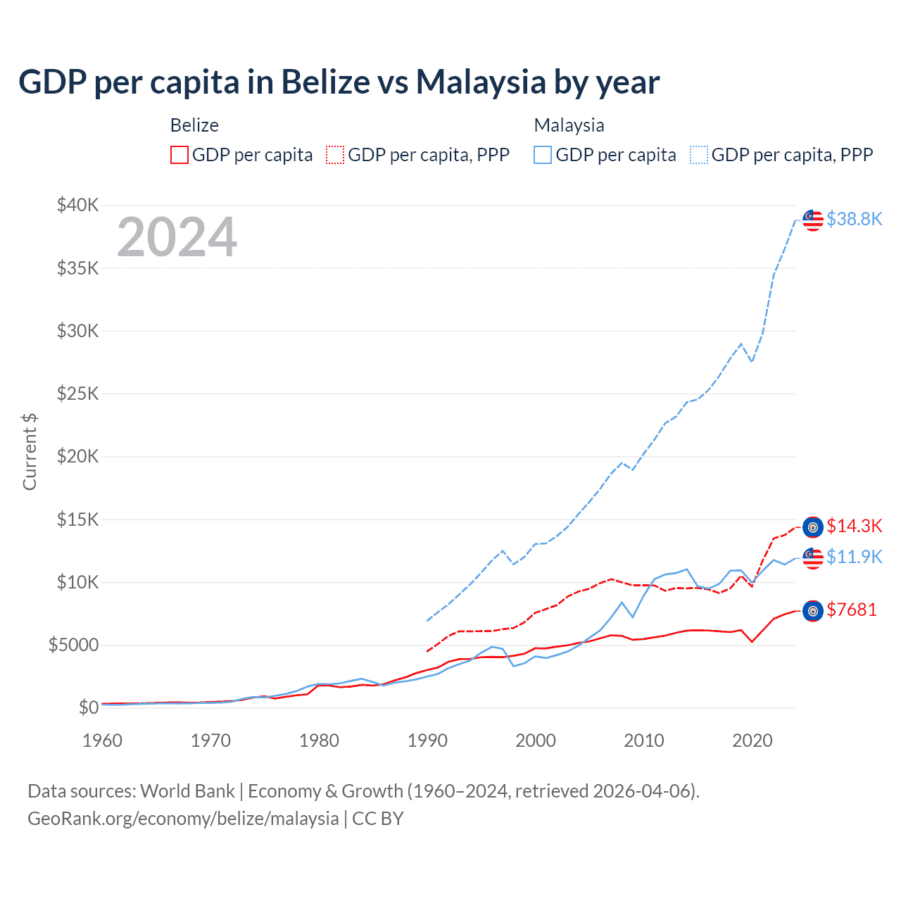 GDP per capita in Belize vs Malaysia by year