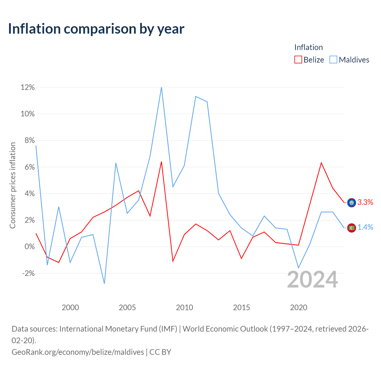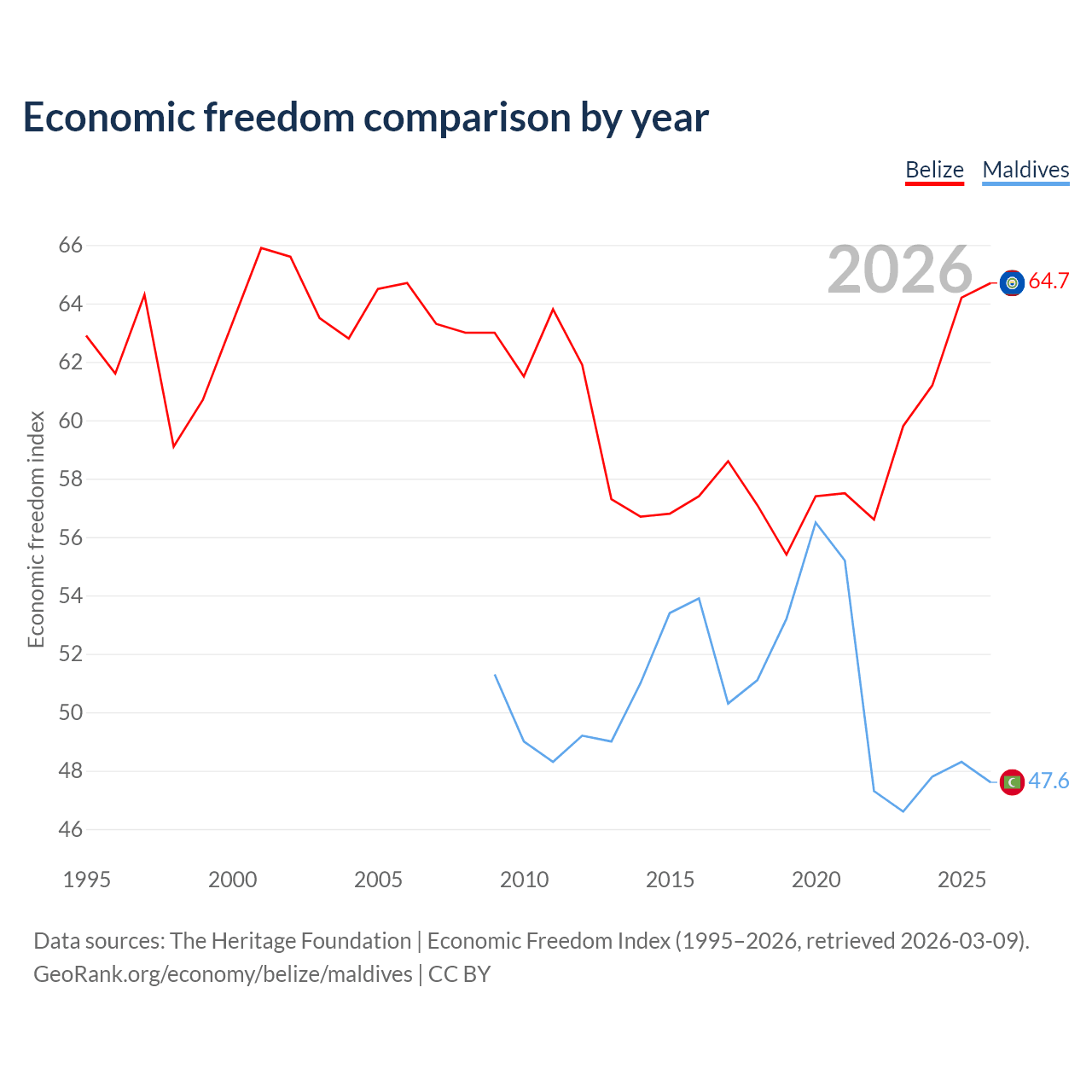 The Economic Freedom Index for Belize is 64.7, ranking 71/197, compared to 47.6 for Maldives, ranking 174/197. The chart above displays a comparison of annual changes in economic freedom indexes.