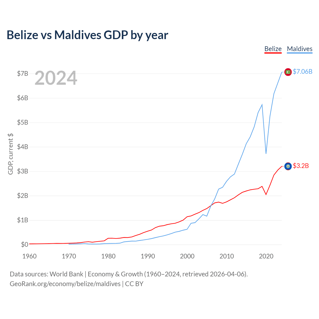 Belize has a GDP of $3.2B compared to $7.06B for Maldives, ranking 168/197 and 159/197 by economy size, respectively.