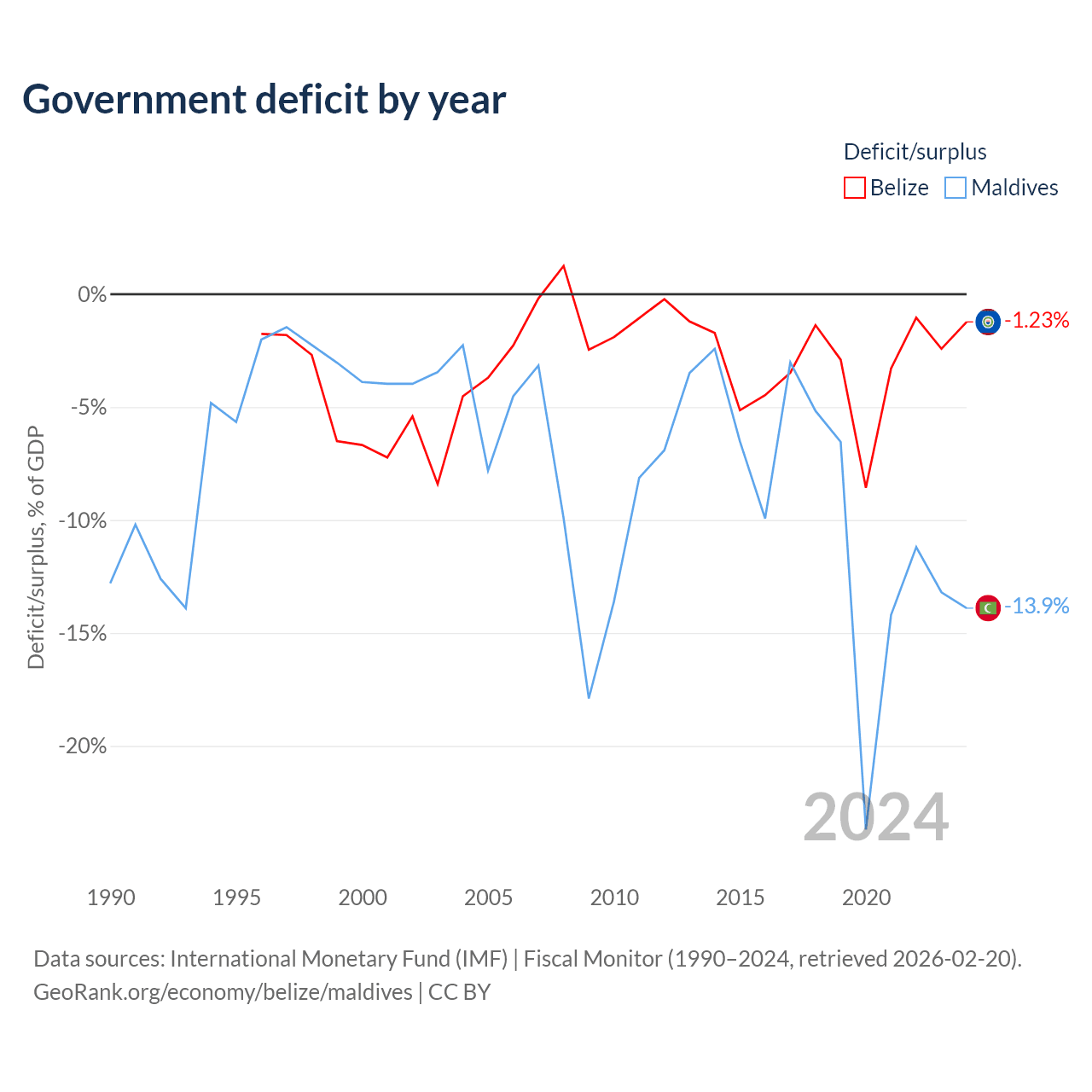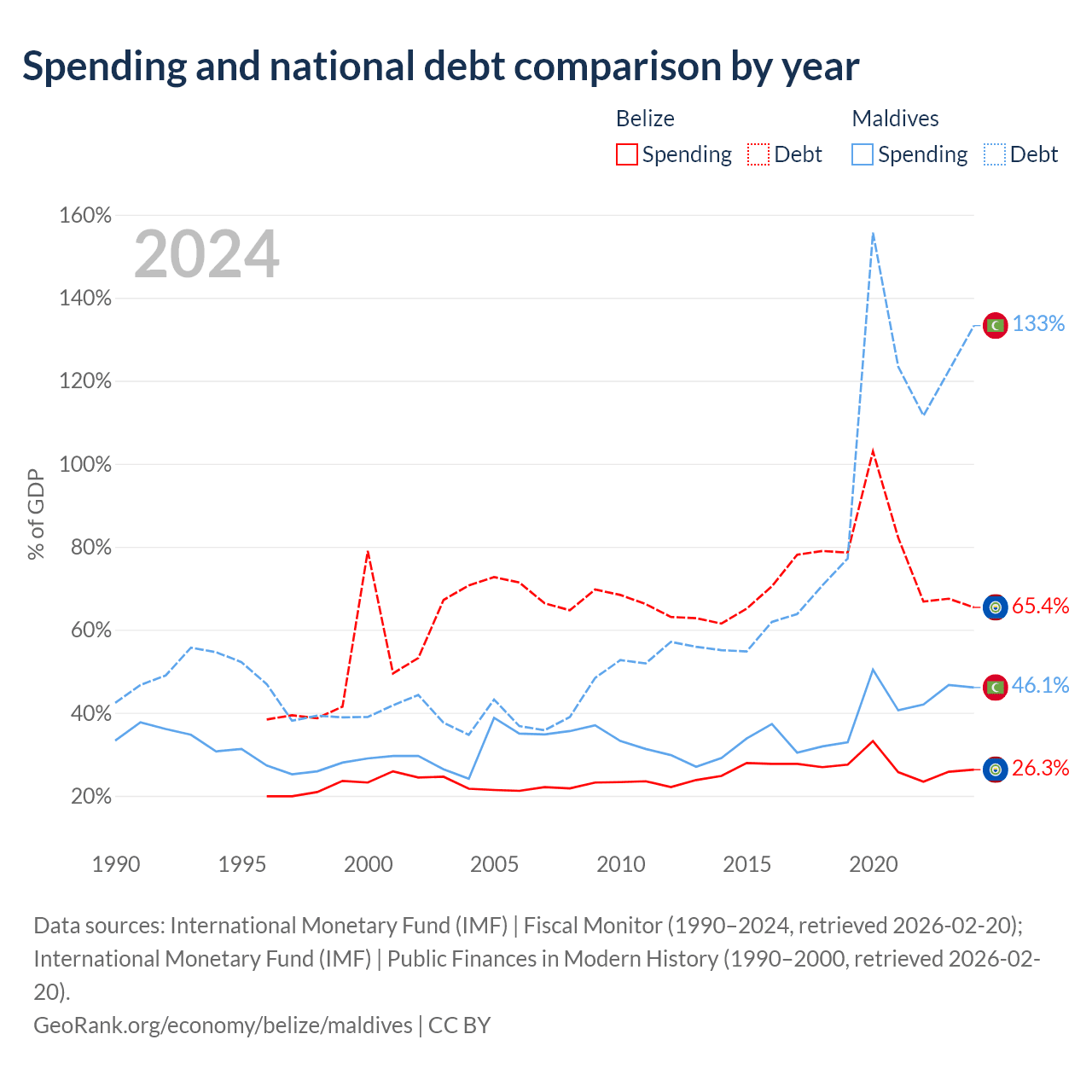 Belize has $2.1B in government debt (65.4% of GDP), compared to $9.41B (133.3% of GDP) in Maldives.