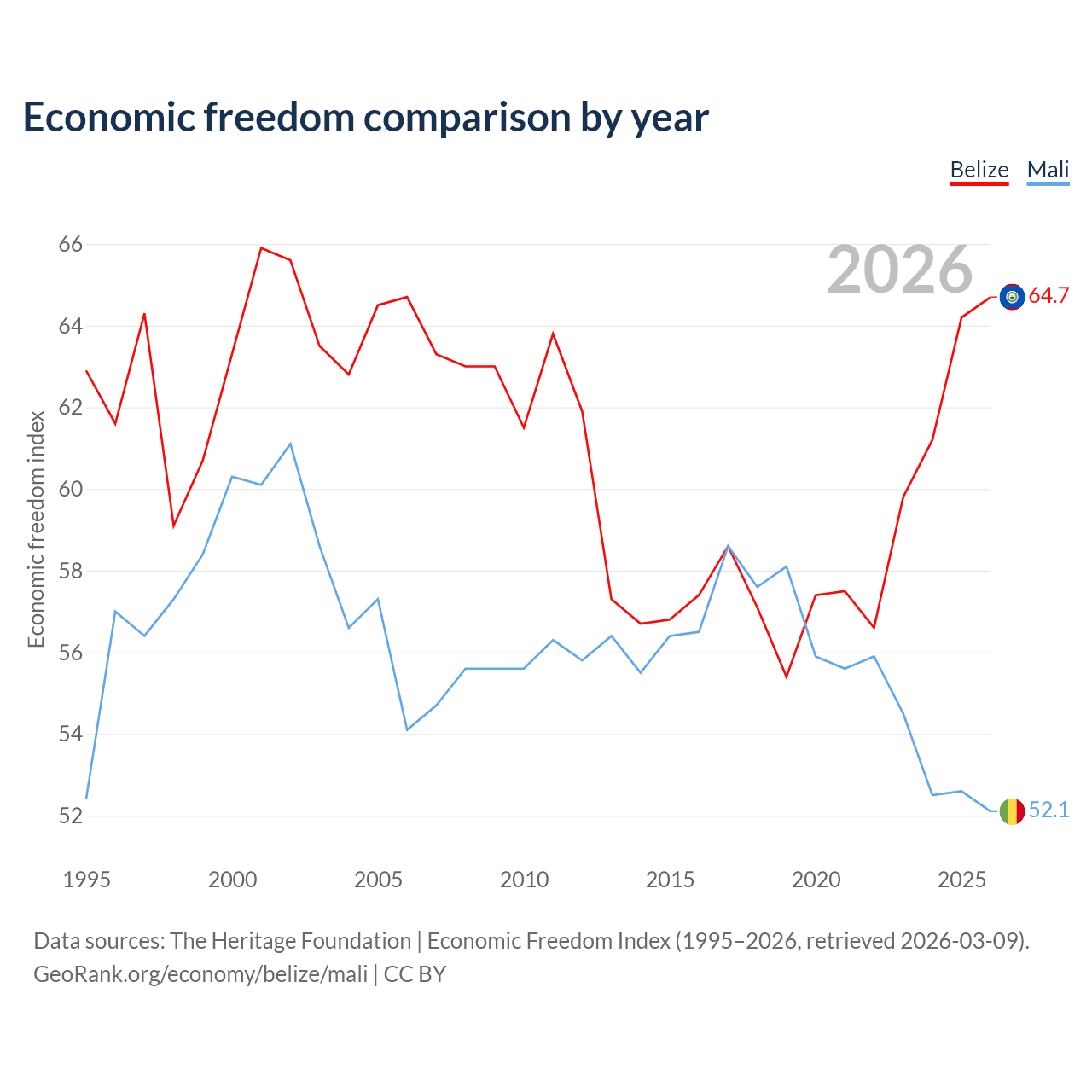 The Economic Freedom Index for Belize is 64.7, ranking 71/197, compared to 52.1 for Mali, ranking 150/197. The chart above displays a comparison of annual changes in economic freedom indexes.