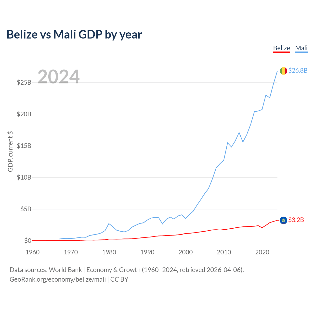 Belize has a GDP of $3.2B compared to $26.8B for Mali, ranking 168/197 and 113/197 by economy size, respectively.