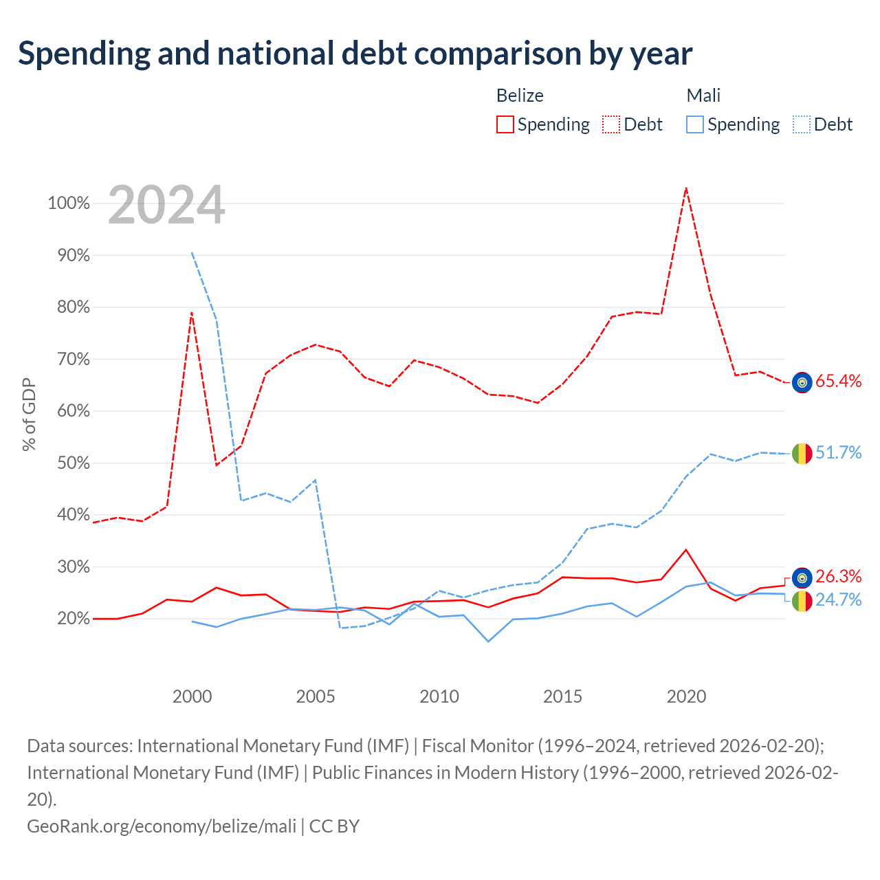Belize has $2.1B in government debt (65.4% of GDP), compared to $13.9B (51.7% of GDP) in Mali.