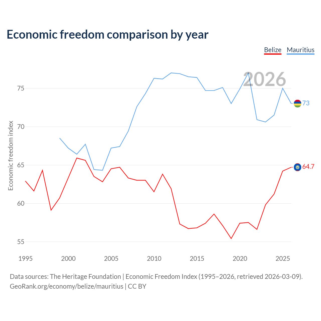 The Economic Freedom Index for Belize is 64.7, ranking 71/197, compared to 73 for Mauritius, ranking 26/197. The chart above displays a comparison of annual changes in economic freedom indexes.