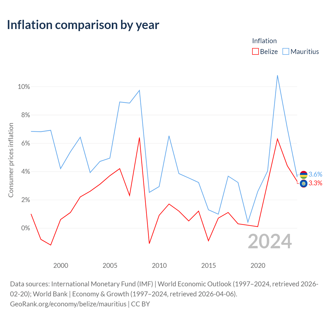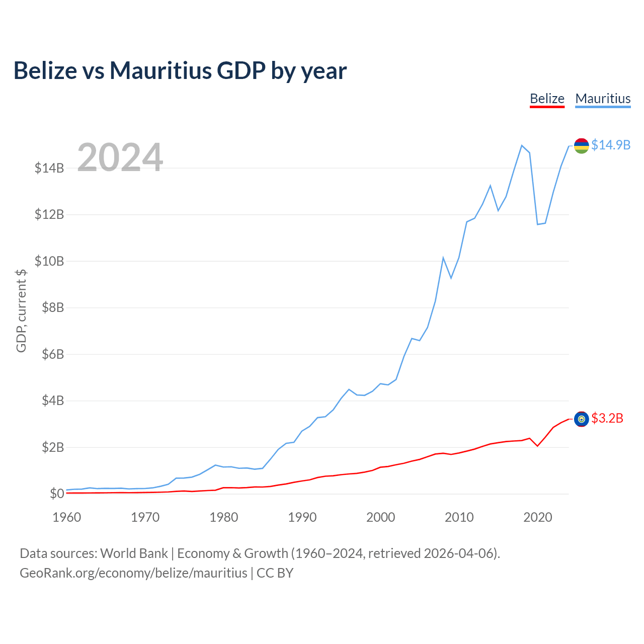 Belize has a GDP of $3.2B compared to $14.9B for Mauritius, ranking 168/197 and 143/197 by economy size, respectively.