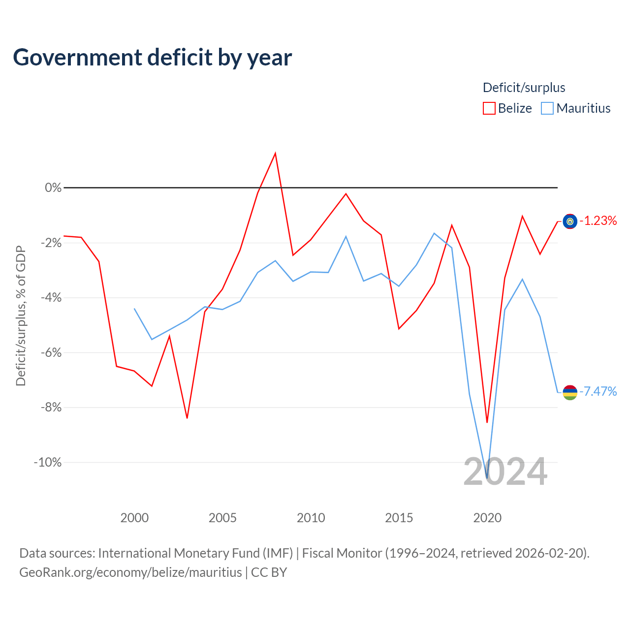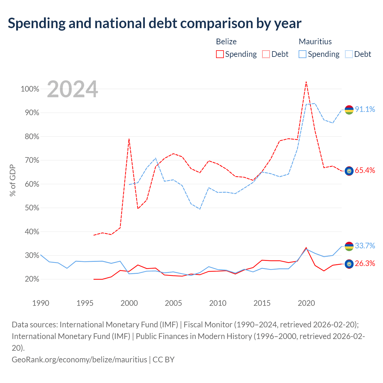 Belize has $2.1B in government debt (65.4% of GDP), compared to $13.6B (91.1% of GDP) in Mauritius.