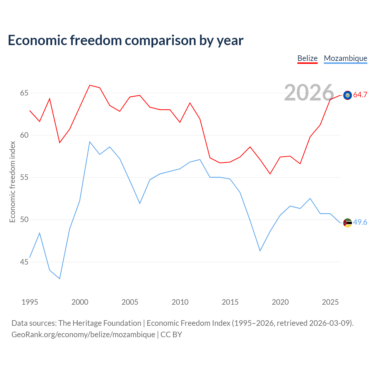 The Economic Freedom Index for Belize is 64.7, ranking 71/197, compared to 49.6 for Mozambique, ranking 164/197. The chart above displays a comparison of annual changes in economic freedom indexes.