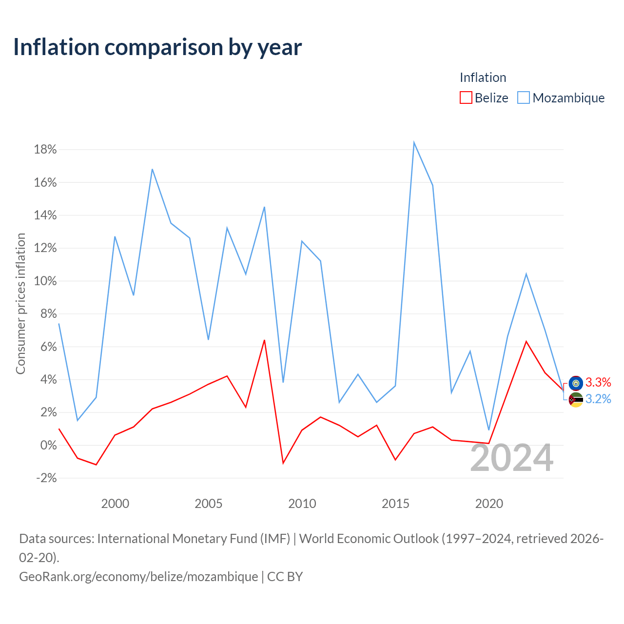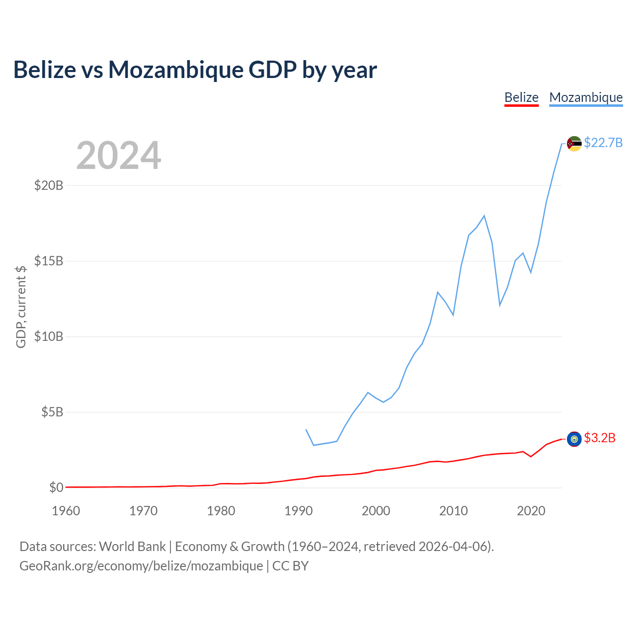 Belize has a GDP of $3.2B compared to $22.7B for Mozambique, ranking 168/197 and 123/197 by economy size, respectively.