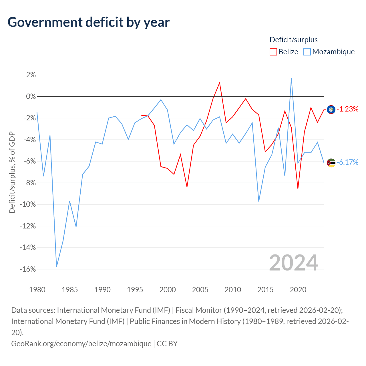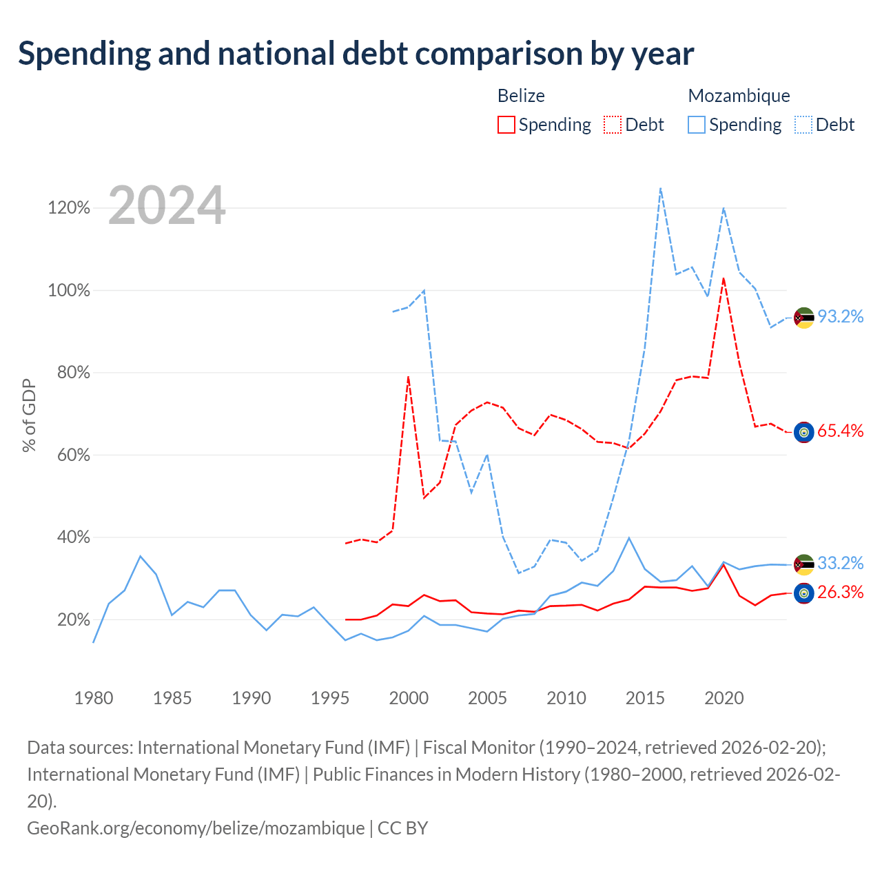 Belize has $2.1B in government debt (65.4% of GDP), compared to $21.2B (93.2% of GDP) in Mozambique.