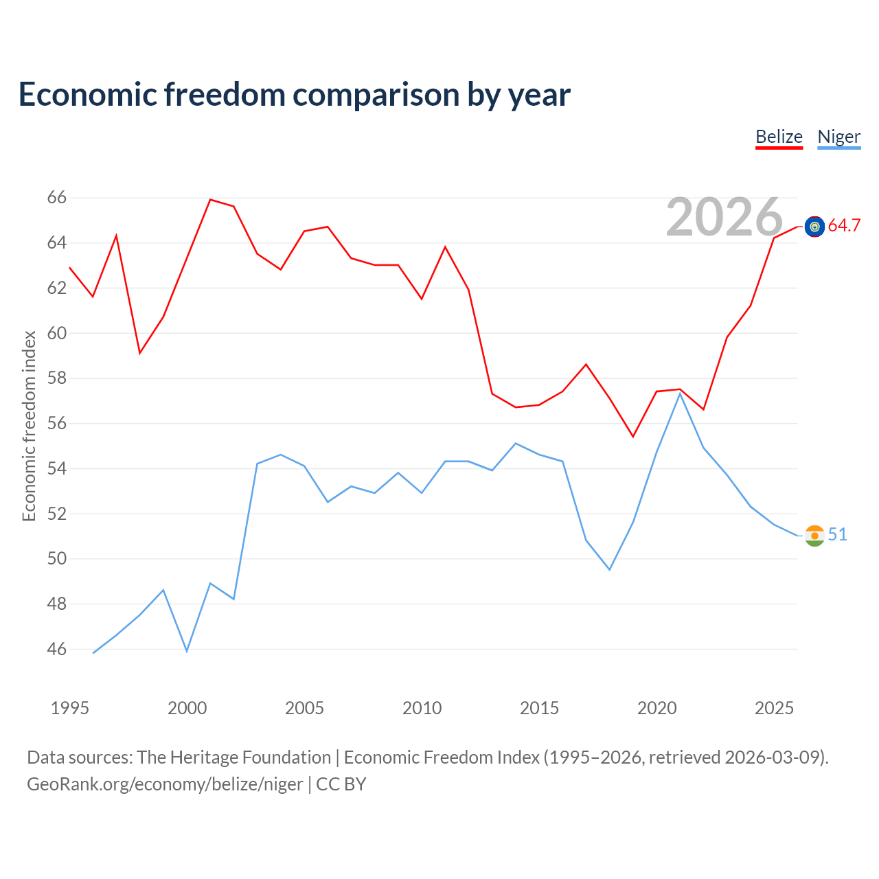The Economic Freedom Index for Belize is 64.7, ranking 71/197, compared to 51 for Niger, ranking 156/197. The chart above displays a comparison of annual changes in economic freedom indexes.